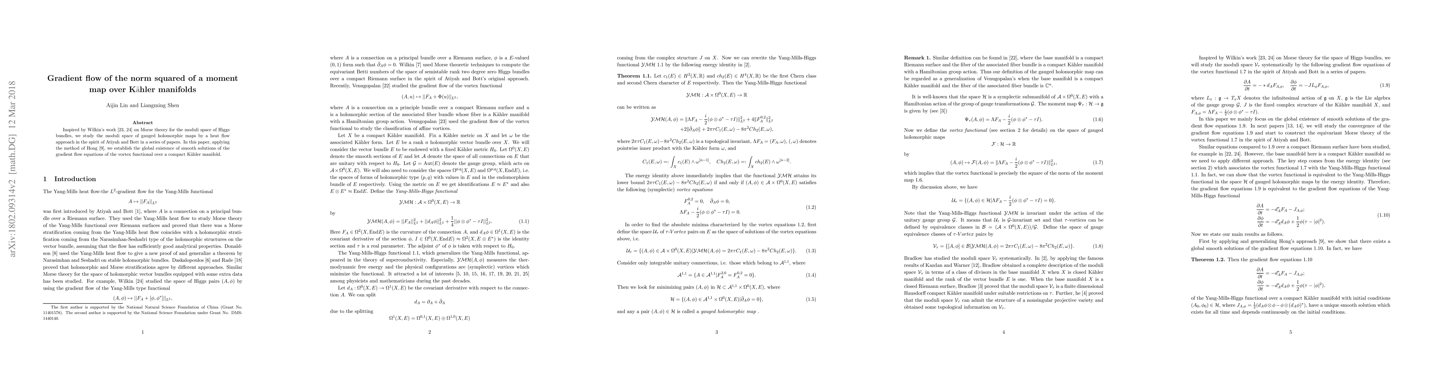 Inspired by Wilkin's work [23, 24] on Morse theory for the moduli space of Higgs bundles, we study the moduli space of gauged holomorphic maps by a heat flow approach in the spirit of Atiyah and Bott in a series of papers. In this paper, applying the method of Hong [9], we establish the global existence of smooth solutions of the gradient ow equations of the vortex functional over a compact Kahler manifold.