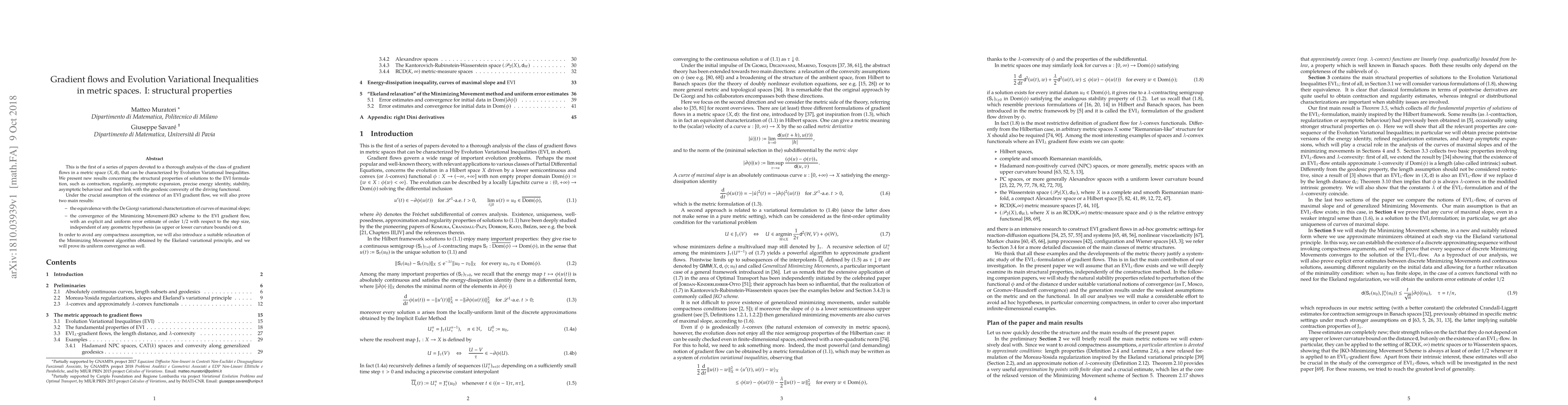 This is the first of a series of papers devoted to a thorough analysis of the class of gradient flows in a metric space $(X,\mathsf{d})$ that can be characterized by Evolution Variational Inequalities. We present new results concerning the structural properties of solutions to the $\mathrm{EVI}$ formulation, such as contraction, regularity, asymptotic expansion, precise energy identity, stability, asymptotic behaviour and their link with the geodesic convexity of the driving functional. Under the crucial assumption of the existence of an $\mathrm{EVI}$ gradient flow, we will also prove two main results: the equivalence with the De Giorgi variational characterization of curves of maximal slope and the convergence of the Minimizing Movement-JKO scheme to the $\mathrm{EVI}$ gradient flow, with an explicit and uniform error estimate of order $1/2$ with respect to the step size, independent of any geometric hypothesis (such as upper or lower curvature bounds) on $\mathsf{d}$. In order to avoid any compactness assumption, we will also introduce a suitable relaxation of the Minimizing Movement algorithm obtained by the Ekeland variational principle, and we will prove its uniform convergence as well.
