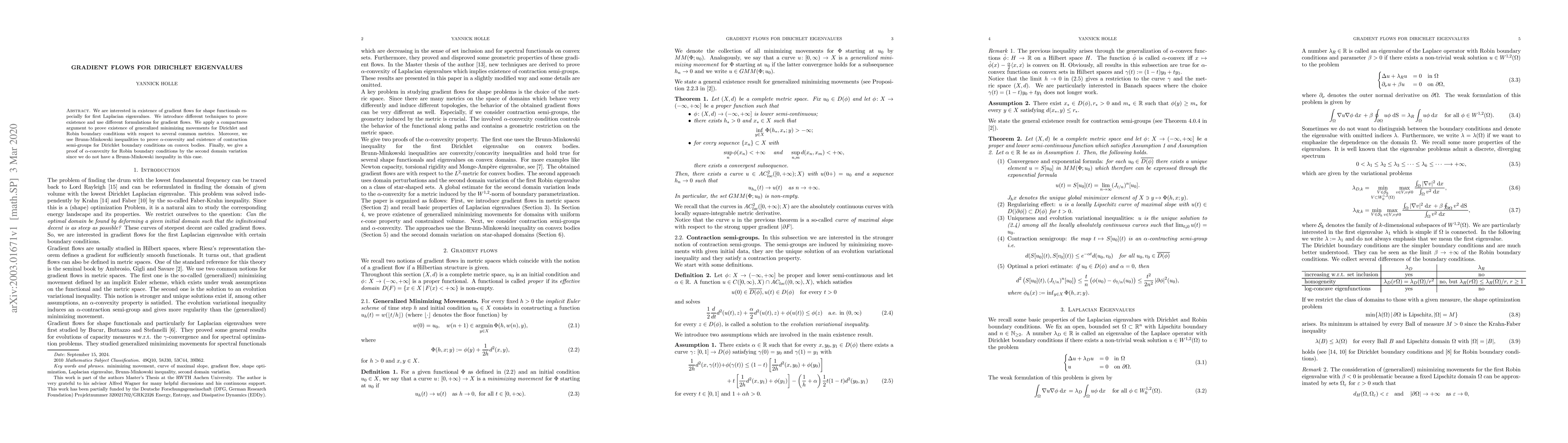This paper investigates the existence of gradient flows for shape functionals, particularly focusing on the first Laplacian eigenvalues. It employs various techniques to prove the existence of generalized minimizing movements under Dirichlet and Robin boundary conditions, leveraging compactness arguments and Brunn-Minkowski inequalities for $\alpha$-convexity.