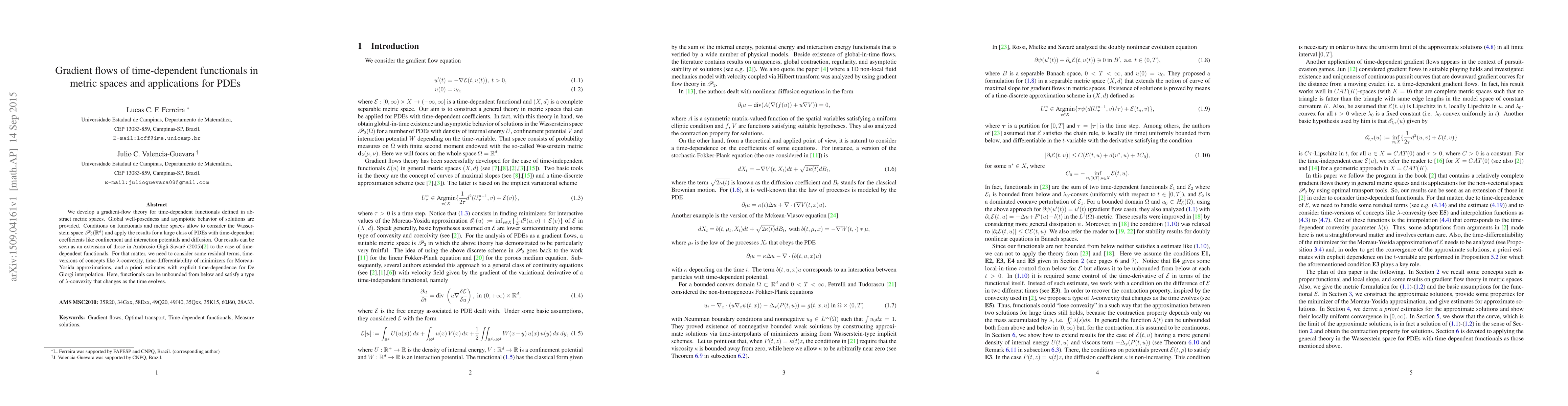 This paper develops a gradient-flow theory for time-dependent functionals in abstract metric spaces, ensuring global well-posedness and asymptotic behavior. It extends previous results to handle time-dependent functionals and applies these findings to a broad class of PDEs with evolving coefficients.