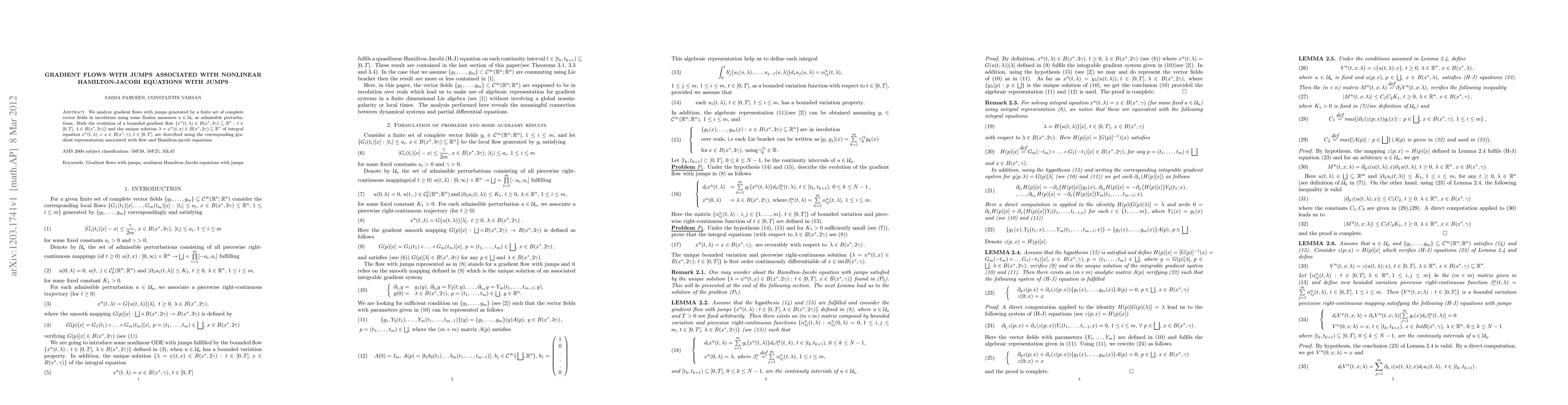 We analyze gradient flows with jumps generated by a finite set of complete vector fields in involution using some Radon measures $u\in \mathcal{U}_a$ as admissible perturbations. Both the evolution of a bounded gradient flow $\{x^u(t,\l)\in B(x^*,3\g)\subseteq \mbn: \,t\in[0,T],\,\l\in B(x^*,2\g)\}$ and the unique solution $\l=\psi^u(t,x)\in B(x^*,2\g)\subseteq \mbn$ of integral equation $x^u(t,\l)=x\in B(x^*,\g), \,t\in[0,T]$, are described using the corresponding gradient representation associated with flow and Hamilton-jacobi equations.