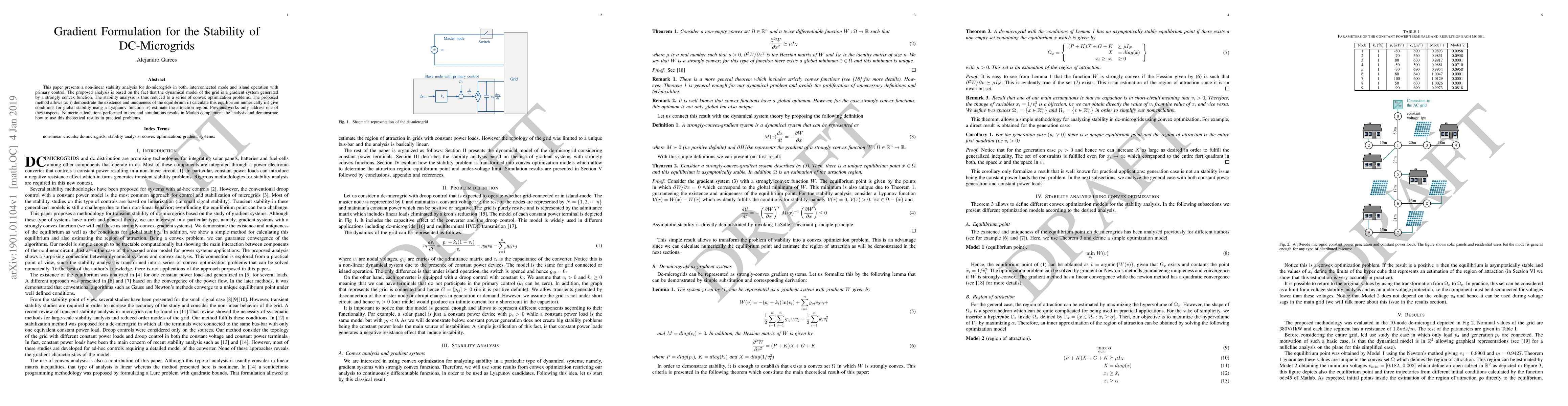 This paper presents a non-linear stability analysis for dc-microgrids in both, interconnected mode and island operation with primary control. The proposed analysis is based on the fact that the dynamical model of the grid is a gradient system generated by a strongly convex function. The stability analysis is thus reduced to a series of convex optimization problems. The proposed method allows to: i) demonstrate the existence and uniqueness of the equilibrium ii) calculate this equilibrium numerically iii) give conditions for global stability using a Lyapunov function iv) estimate the attraction region. Previous works only address one of these aspects. Numeric calculations performed in cvx and simulations results in Matlab complement the analysis and demonstrate how to use this theoretical results in practical problems.