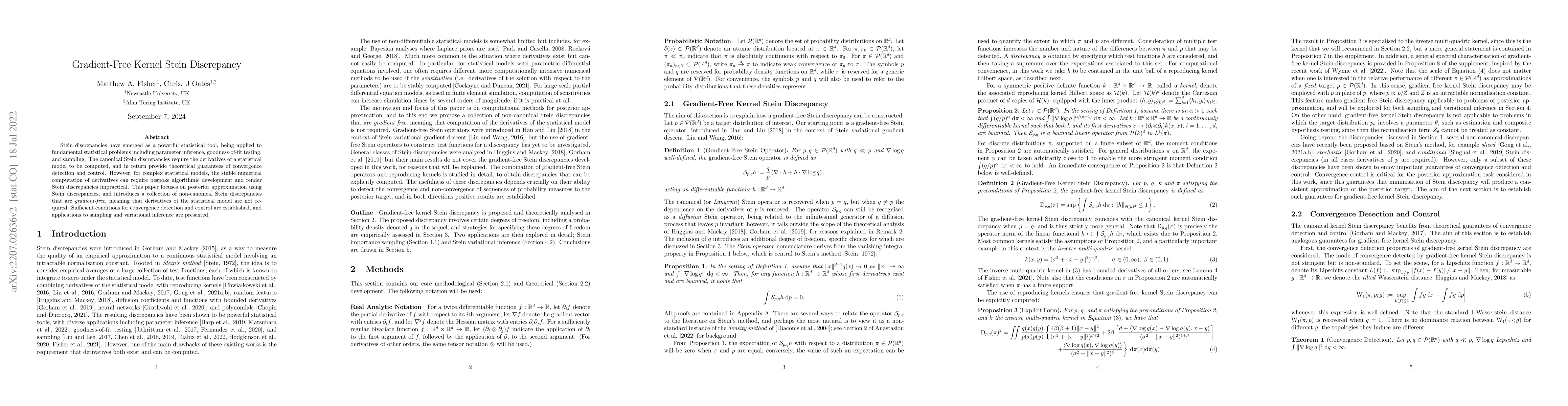 This paper introduces gradient-free kernel Stein discrepancies to address the impracticality of computing derivatives for complex statistical models. It establishes convergence detection and control conditions, and demonstrates applications in sampling and variational inference.