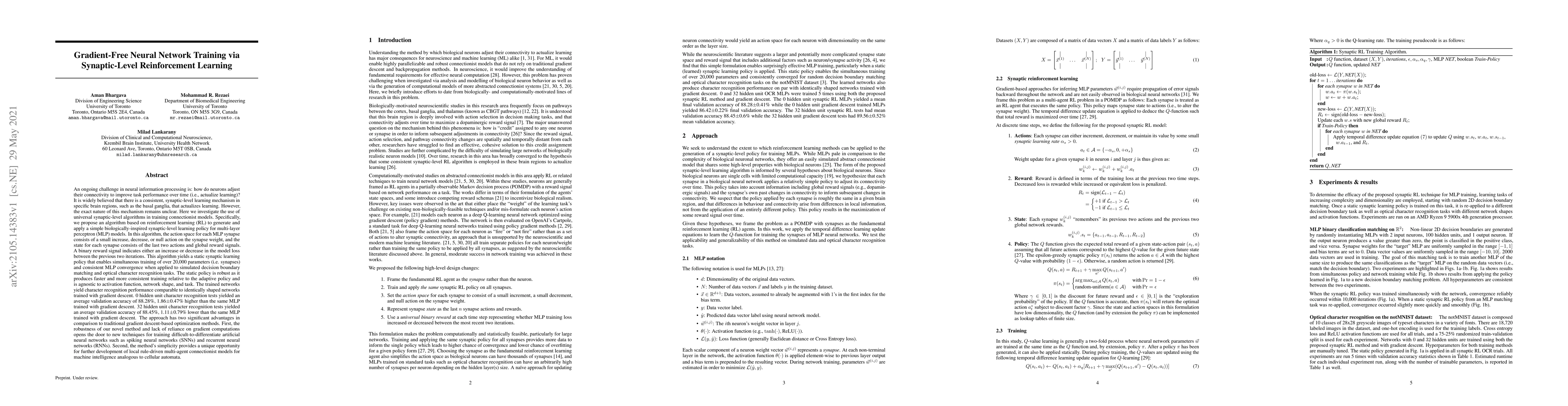 This paper proposes a gradient-free neural network training method using synaptic-level reinforcement learning, achieving comparable performance to gradient descent in character recognition tasks. The method's simplicity and robustness suggest potential applications in training difficult-to-differentiate neural networks like spiking and recurrent neural networks.