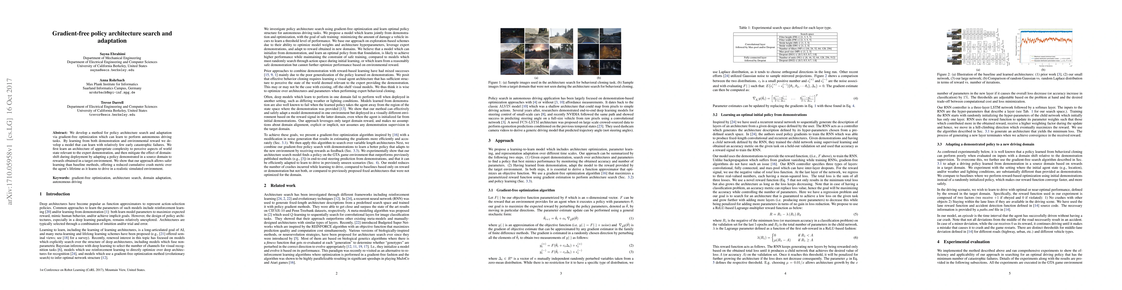 We develop a method for policy architecture search and adaptation via gradient-free optimization which can learn to perform autonomous driving tasks. By learning from both demonstration and environmental reward we develop a model that can learn with relatively few early catastrophic failures. We first learn an architecture of appropriate complexity to perceive aspects of world state relevant to the expert demonstration, and then mitigate the effect of domain-shift during deployment by adapting a policy demonstrated in a source domain to rewards obtained in a target environment. We show that our approach allows safer learning than baseline methods, offering a reduced cumulative crash metric over the agent's lifetime as it learns to drive in a realistic simulated environment.