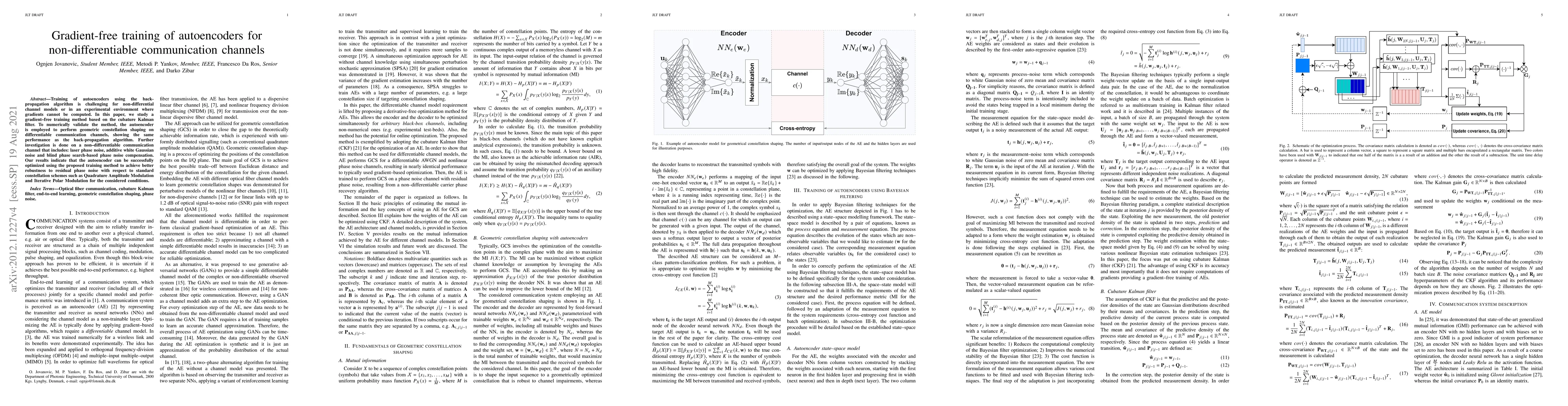 This paper proposes a gradient-free training method for autoencoders using the cubature Kalman filter, suitable for non-differentiable communication channels. The method is validated on differentiable channels and shown to achieve comparable performance to back-propagation, while demonstrating enhanced robustness under non-differentiable conditions like laser phase noise.