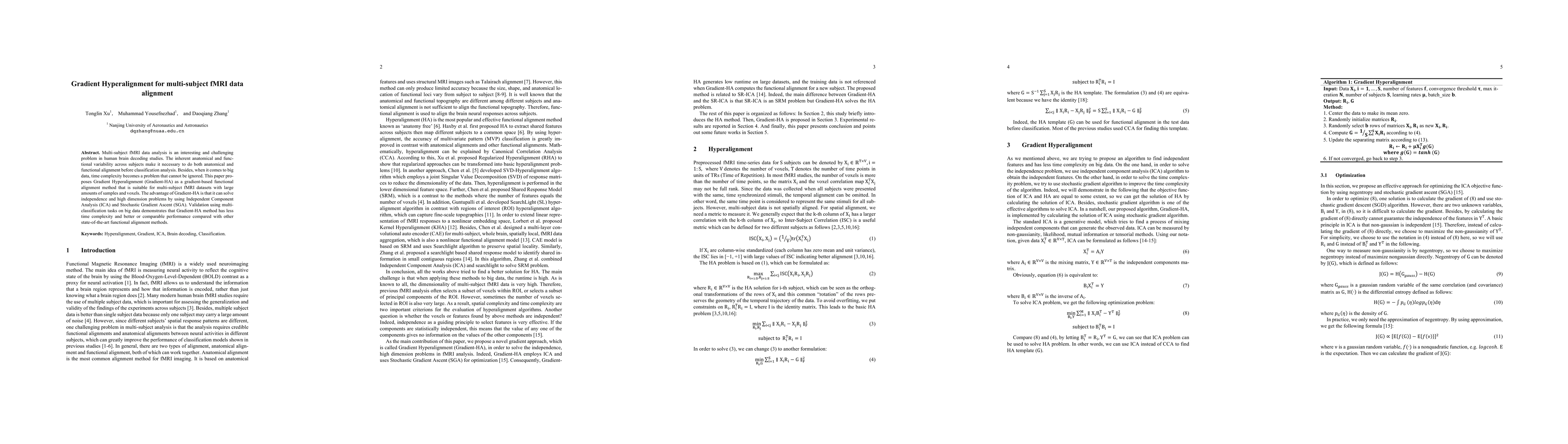 Gradient Hyperalignment (Gradient-HA) is a gradient-based functional alignment method for multi-subject fMRI data, addressing independence and high-dimensionality issues via ICA and SGA. It demonstrates lower time complexity and competitive performance in multi-classification tasks on large datasets compared to other alignment techniques.