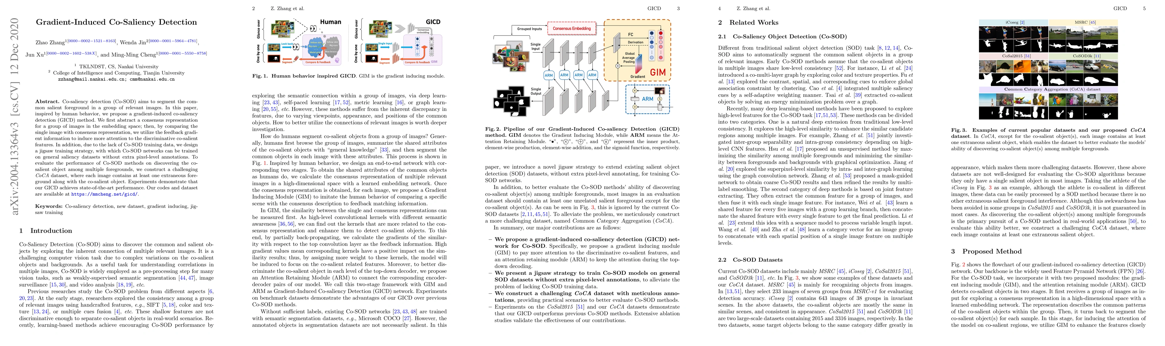 This paper introduces a gradient-induced co-saliency detection (GICD) method to segment common salient objects in a group of relevant images. It leverages consensus representation and gradient feedback to highlight discriminative features, and employs a jigsaw training strategy to train on general saliency datasets. The method is evaluated on a new CoCA dataset, achieving state-of-the-art performance.