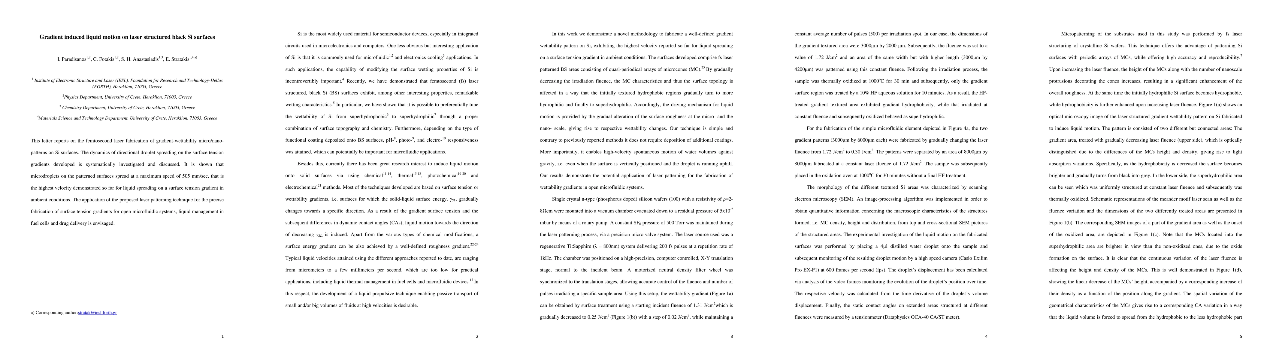This letter reports on the femtosecond laser fabrication of gradient-wettability micro/nano- patterns on Si surfaces. The dynamics of directional droplet spreading on the surface tension gradients developed is systematically investigated and discussed. It is shown that microdroplets on the patterned surfaces spread at a maximum speed of 505 mm/sec, that is the highest velocity demonstrated so far for liquid spreading on a surface tension gradient in ambient conditions. The application of the proposed laser patterning technique for the precise fabrication of surface tension gradients for open microfluidic systems, liquid management in fuel cells and drug delivery is envisaged.