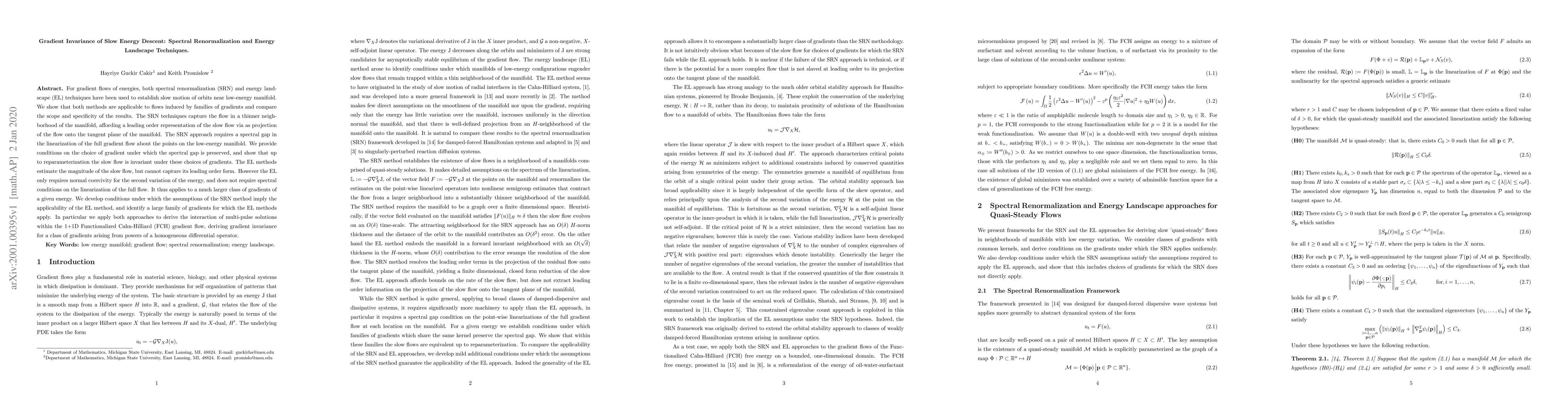 For gradient flows of energies, both spectral renormalization (SRN) and energy landscape (EL) techniques have been used to establish slow motion of orbits near low-energy manifold. We show that both methods are applicable to flows induced by families of gradients and compare the scope and specificity of the results. The SRN techniques capture the flow in a thinner neighborhood of the manifold, affording a leading order representation of the slow flow via as projection of the flow onto the tangent plane of the manifold. The SRN approach requires a spectral gap in the linearization of the full gradient flow about the points on the low-energy manifold. We provide conditions on the choice of gradient under which the spectral gap is preserved, and show that up to reparameterization the slow flow is invariant under these choices of gradients. The EL methods estimate the magnitude of the slow flow, but cannot capture its leading order form. However the EL only requires normal coercivity for the second variation of the energy, and does not require spectral conditions on the linearization of the full flow. It thus applies to a much larger class of gradients of a given energy. We develop conditions under which the assumptions of the SRN method imply the applicability of the EL method, and identify a large family of gradients for which the EL methods apply. In particular we apply both approaches to derive the interaction of multi-pulse solutions within the 1+1D Functionalized Cahn-Hilliard (FCH) gradient flow, deriving gradient invariance for a class of gradients arising from powers of a homogeneous differential operator.