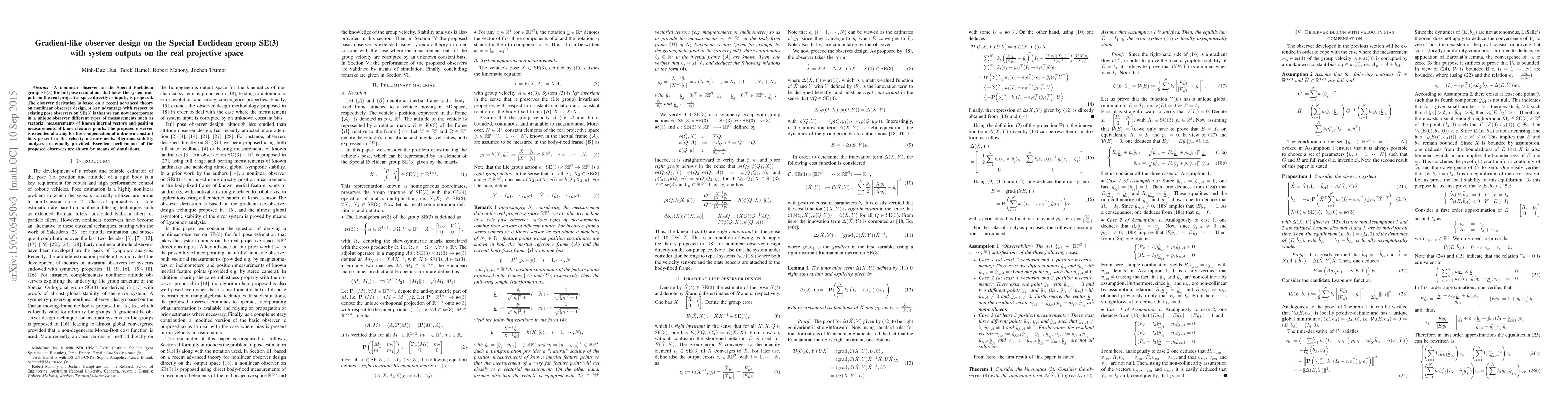 A new nonlinear observer design is proposed for estimating full pose on the Special Euclidean group SE(3) using system outputs from real projective space, with improved capabilities for various measurements.