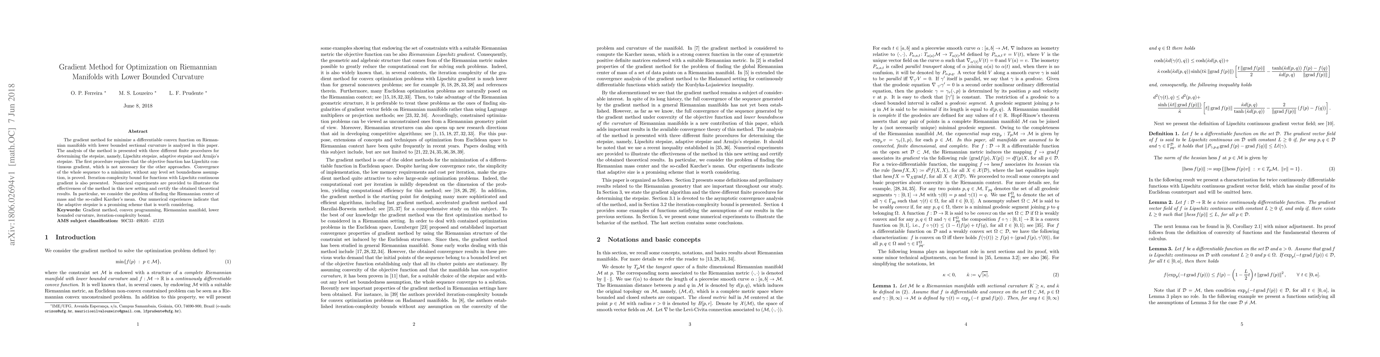 This paper analyzes the gradient method for optimizing convex functions on Riemannian manifolds with lower bounded curvature, presenting three stepsize determination procedures. It proves convergence without boundedness assumptions and provides iteration-complexity bounds, with numerical experiments highlighting the effectiveness of the adaptive stepsize.