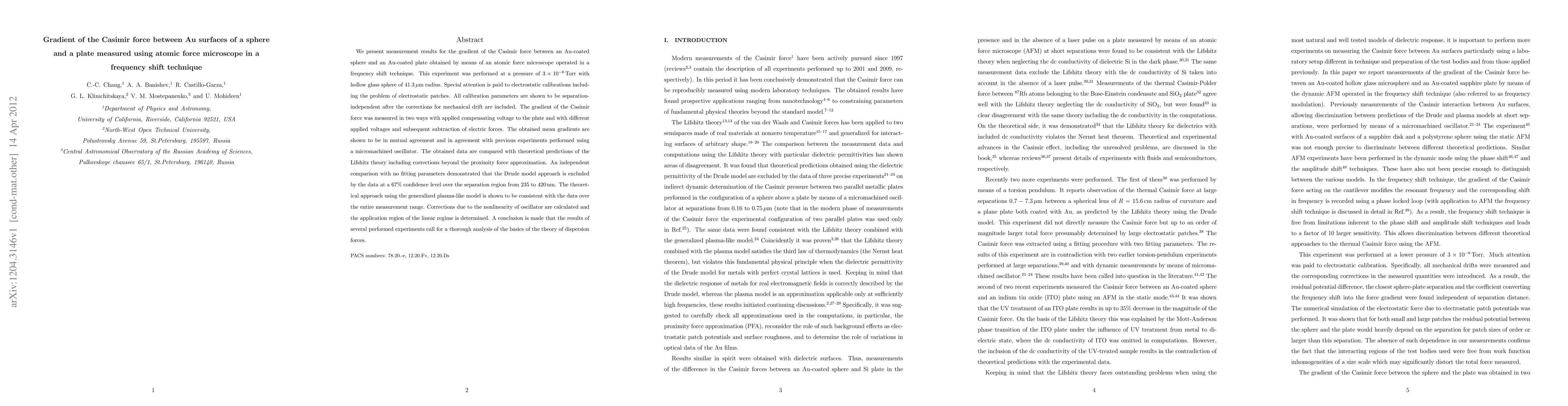 We present measurement results for the gradient of the Casimir force between an Au-coated sphere and an Au-coated plate obtained by means of an atomic force microscope operated in a frequency shift technique. This experiment was performed at a pressure of 3x10^{-8} Torr with hollow glass sphere of 41.3 mcm radius. Special attention is paid to electrostatic calibrations including the problem of electrostatic patches. All calibration parameters are shown to be separation-independent after the corrections for mechanical drift are included. The gradient of the Casimir force was measured in two ways with applied compensating voltage to the plate and with different applied voltages and subsequent subtraction of electric forces. The obtained mean gradients are shown to be in mutual agreement and in agreement with previous experiments performed using a micromachined oscillator. The obtained data are compared with theoretical predictions of the Lifshitz theory including corrections beyond the proximity force approximation. An independent comparison with no fitting parameters demonstrated that the Drude model approach is excluded by the data at a 67% confidence level over the separation region from 235 to 420 nm. The theoretical approach using the generalized plasma-like model is shown to be consistent with the data over the entire measurement range. Corrections due to the nonlinearity of oscillator are calculated and the application region of the linear regime is determined. A conclusion is made that the results of several performed experiments call for a thorough analysis of the basics of the theory of dispersion forces.