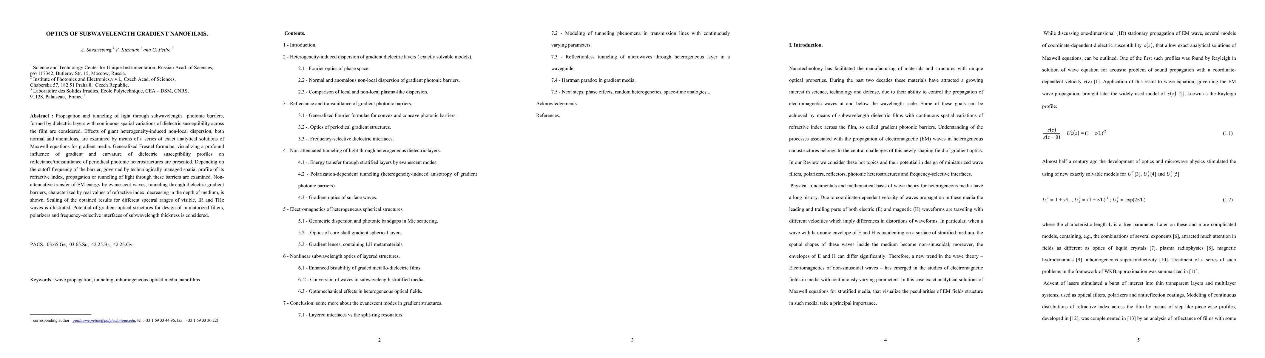 This paper explores the propagation and tunneling of light through subwavelength photonic barriers with gradient refractive indices, revealing non-local dispersion effects and presenting generalized Fresnel formulae. The study highlights the potential of gradient optical structures for designing miniaturized filters and frequency-selective interfaces.