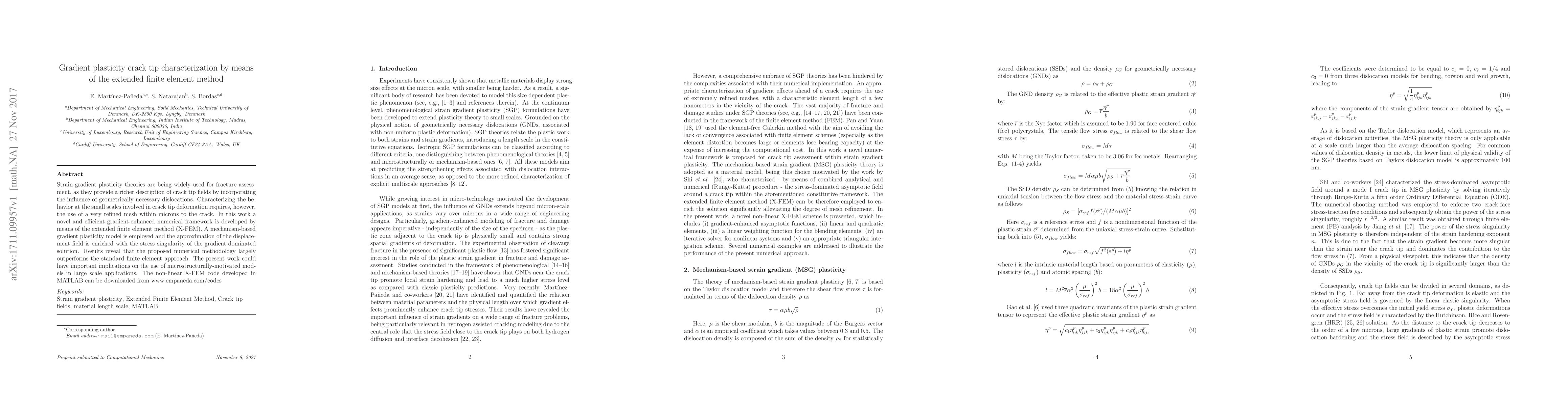 This paper develops a gradient-enhanced numerical framework using the extended finite element method (X-FEM) to characterize crack tip fields in strain gradient plasticity, showing improved performance over standard finite element methods. The proposed method enriches the displacement field with stress singularity, offering significant implications for microstructurally-motivated models in large-scale applications.