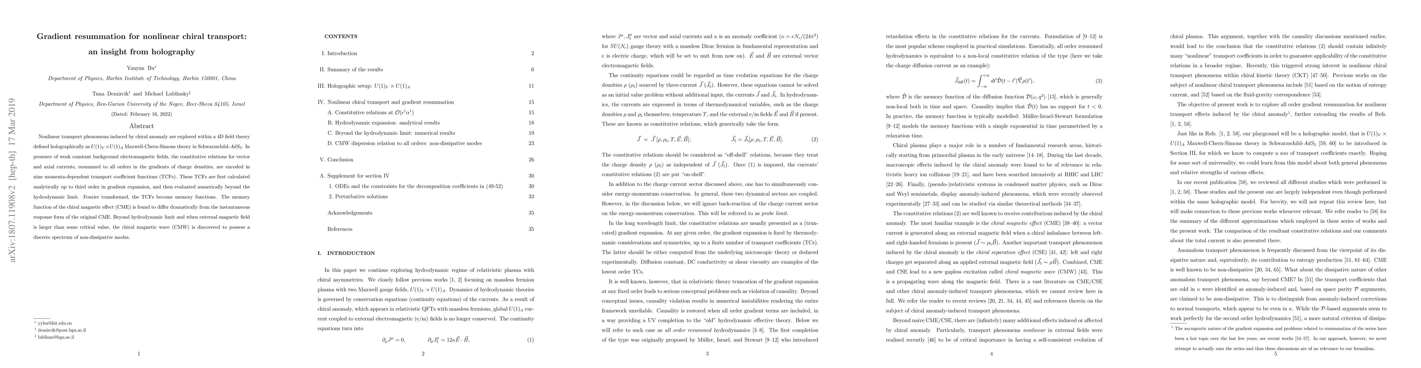 This paper investigates nonlinear chiral transport phenomena in a holographic $U(1)_V\times U(1)_A$ Maxwell-Chern-Simons theory, finding that gradient resummation leads to nine momenta-dependent transport coefficient functions, which reveal a non-instantaneous chiral magnetic effect and a discrete spectrum of non-dissipative chiral magnetic waves.