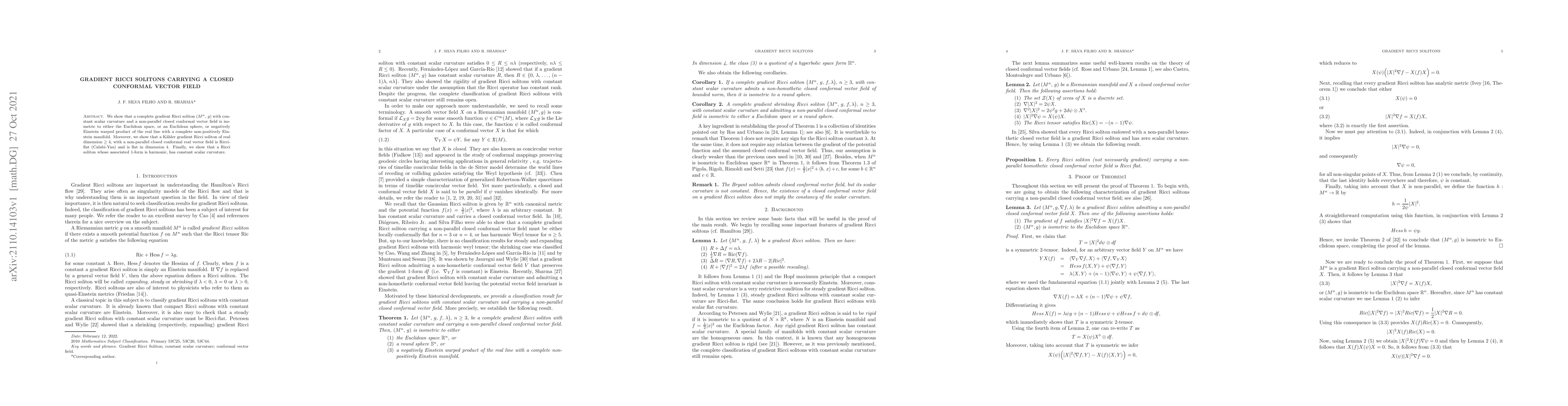 We show that a complete gradient Ricci soliton $(M^n,\,g)$ with constant scalar curvature and a non-parallel closed conformal vector field is isometric to either the Euclidean space, or an Euclidean sphere, or negatively Einstein warped product of the real line with a complete non-positively Einstein manifold. Moreover, we show that a K\"ahler gradient Ricci soliton of real dimension $\ge 4$, with a non-parallel closed conformal real vector field is Ricci-flat (Calabi-Yau) and is flat in dimension 4. Finally, we show that a Ricci soliton whose associated 1-form is harmonic, has constant scalar curvature.