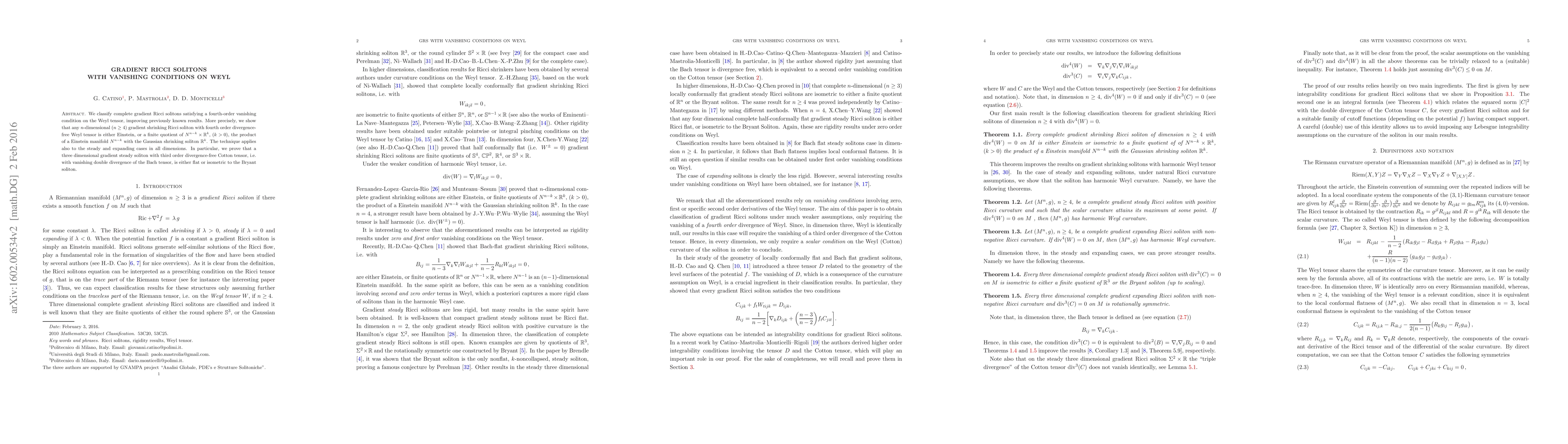 This paper classifies complete gradient Ricci solitons under a fourth-order vanishing condition on the Weyl tensor, demonstrating that such solitons in $n$-dimensions ($n\geq 4$) are either Einstein or a product of an Einstein manifold and a Gaussian soliton. It also applies to steady and expanding cases across dimensions, showing that a three-dimensional steady soliton with a third-order divergence-free Cotton tensor is either flat or the Bryant soliton.