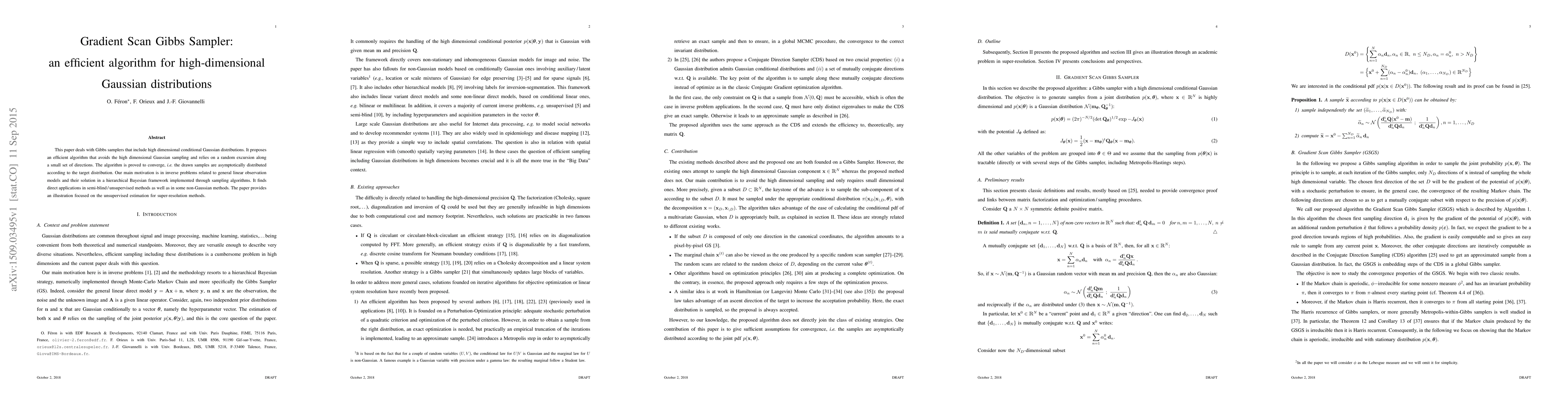This paper proposes an efficient algorithm for sampling from high-dimensional Gaussian distributions using a gradient scan Gibbs sampler, with applications in inverse problems and unsupervised estimation.