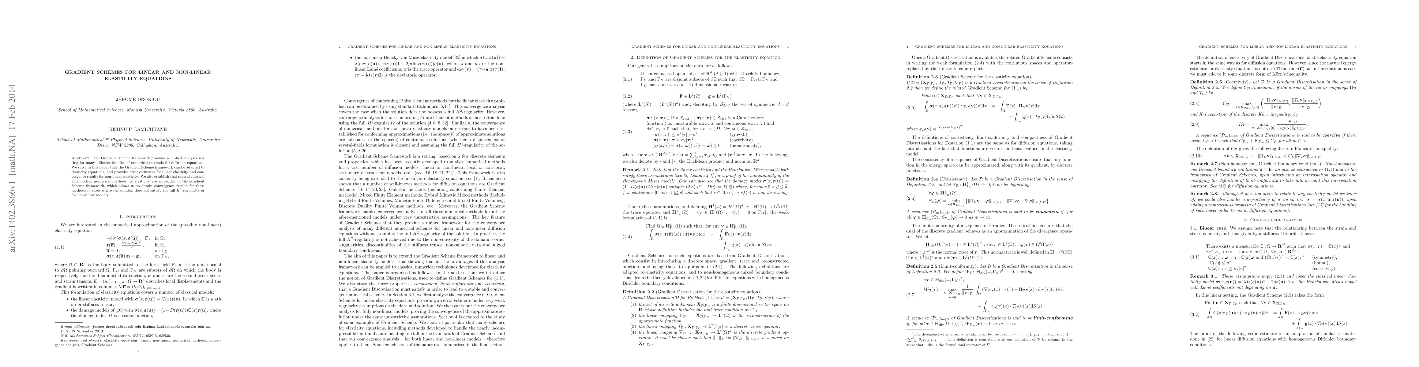This paper adapts the Gradient Scheme framework to elasticity equations, providing error estimates for linear elasticity and convergence results for non-linear elasticity. It also shows that various classical and modern numerical methods for elasticity are encompassed within this framework, enabling convergence results even when the solution lacks full $H^2$-regularity.