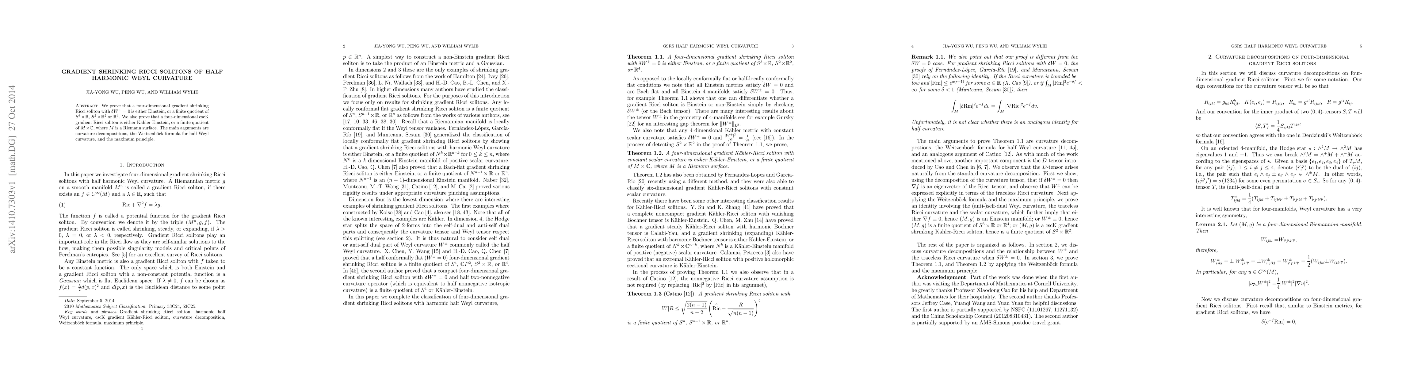 We prove that a four-dimensional gradient shrinking Ricci soliton with $\delta W^{\pm}=0$ is either Einstein, or a finite quotient of $S^3\times\mathbb{R}$, $S^2\times\mathbb{R}^2$ or $\mathbb{R}^4$. We also prove that a four-dimensional cscK gradient Ricci soliton is either K\"ahler-Einstein, or a finite quotient of $M\times\mathbb{C}$, where $M$ is a Riemann surface. The main arguments are curvature decompositions, the Weitzenb\"ock formula for half Weyl curvature, and the maximum principle.