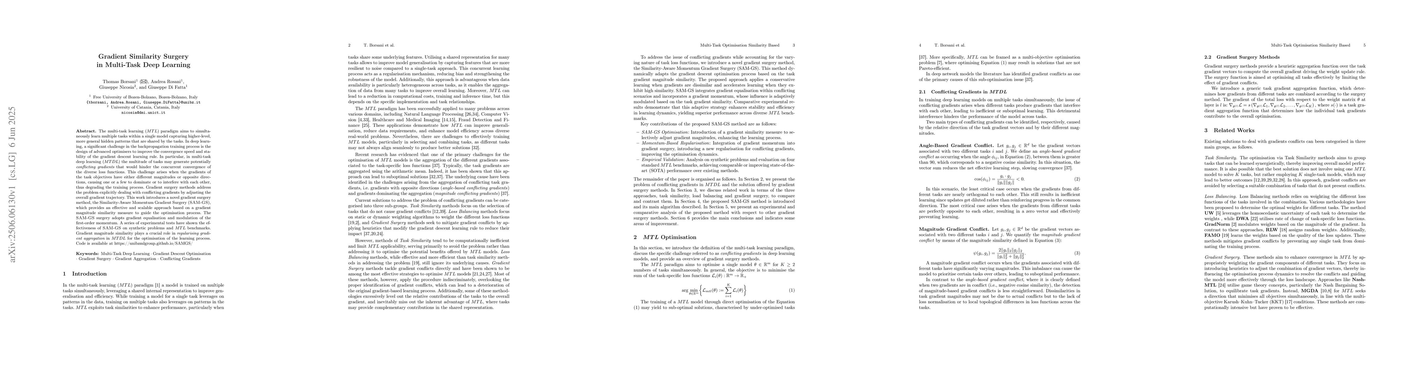 A new method called Similarity-Aware Momentum Gradient Surgery (SAM-GS) is introduced to address conflicts in gradients during multi-task deep learning, achieving effective convergence on synthetic problems and benchmarks.