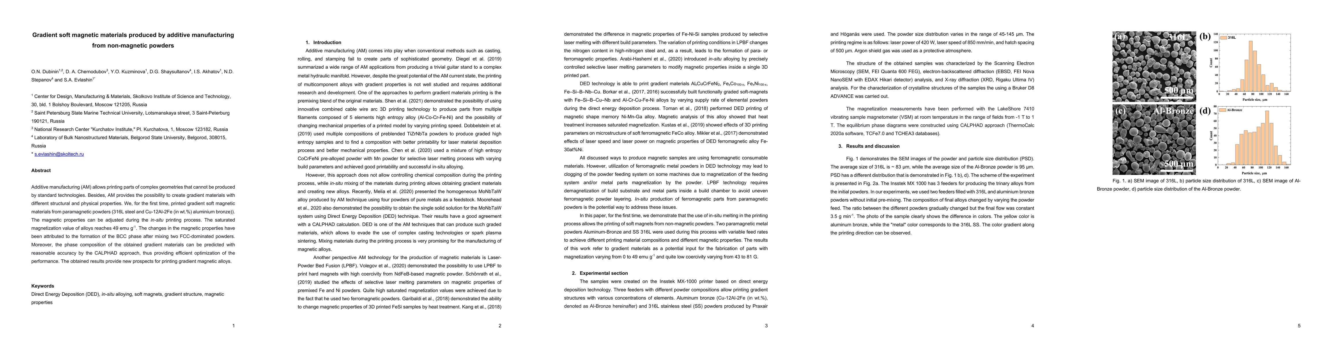 This paper reports the first additive manufacturing of gradient soft magnetic materials from non-magnetic powders, achieving tunable magnetic properties and a BCC phase formation. The CALPHAD approach enables accurate phase composition prediction, optimizing material performance.