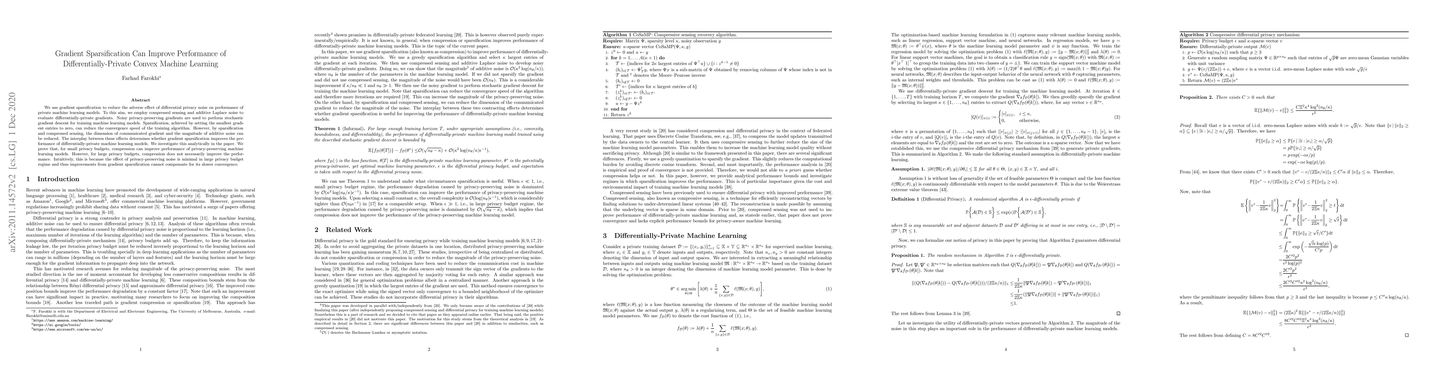 This paper explores how gradient sparsification can enhance the performance of differentially-private convex machine learning models by reducing noise and communication costs. It finds that while sparsification can improve performance for small privacy budgets, it does not necessarily benefit models with large privacy budgets due to minimal noise effects.