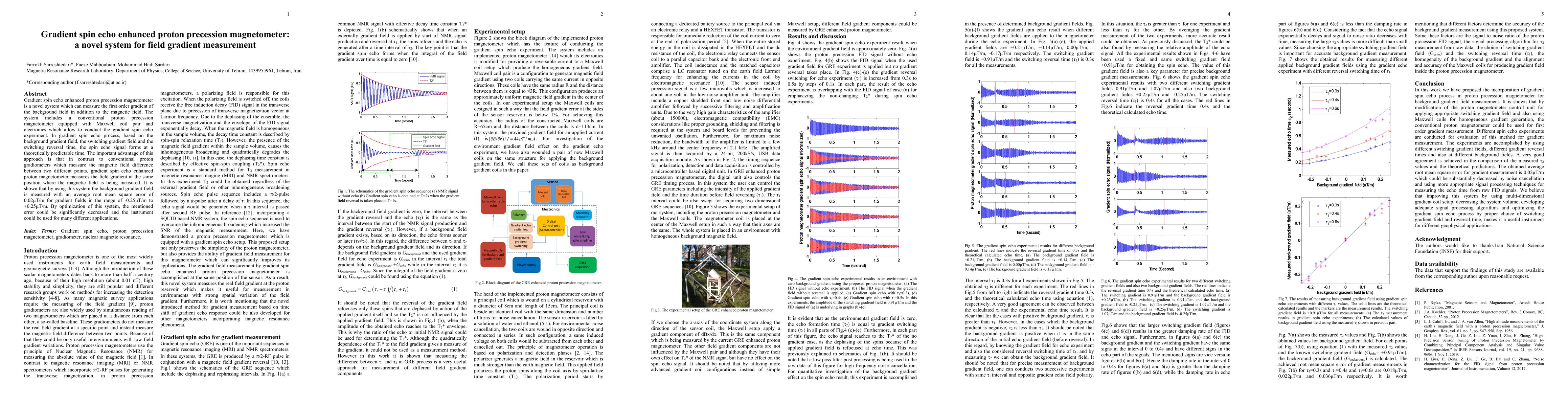 Gradient spin echo enhanced proton precession magnetometer is a novel system which can measure the first order gradient of the background field in addition to the magnetic field. The system includes a conventional proton precession magnetometer equipped with Maxwell coil pair and electronics which allow to conduct the gradient spin echo experiment. In gradient spin echo process, based on the background gradient field, the switching gradient field and the switching reversal time, the spin echo signal forms at a theoretically predictable time. The important advantage of this approach is that in contrast to conventional proton gradiometers which measure the magnetic field difference between two different points, gradient spin echo enhanced proton magnetometer measures the field gradient at the same position where the magnetic field is being measured. It is shown that by using this system the background gradient field is measured with an average root mean square error of 0.02{\mu}T/m for gradient fields in the range of -0.25{\mu}T/m to +0.25{\mu}T/m. By optimization of this system, the mentioned error could be significantly decreased and the instrument could be used for many different applications.