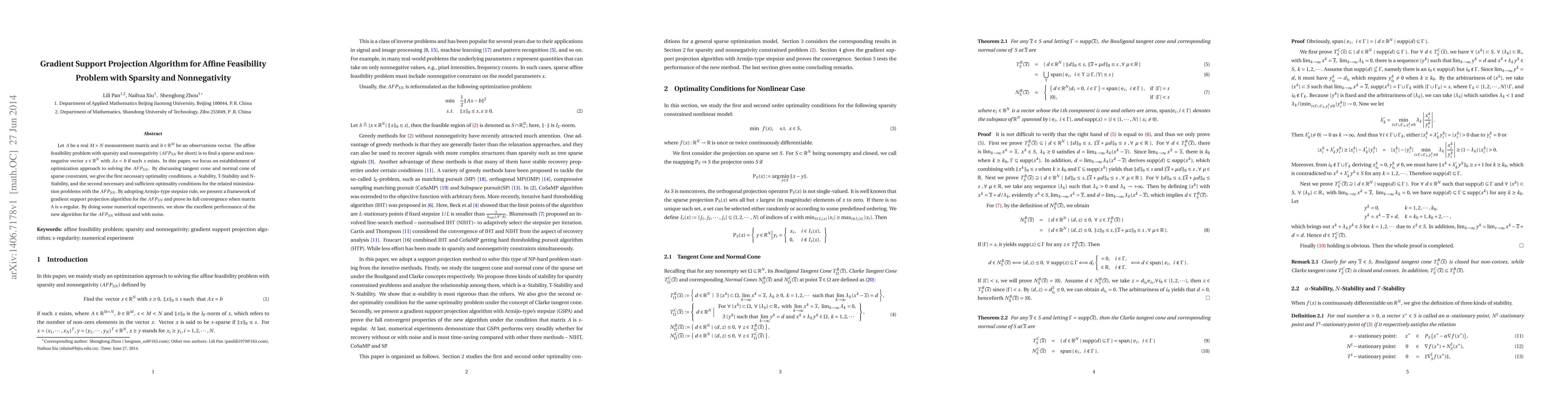 Let $A$ be a real $M \times N$ measurement matrix and $b\in \mathbb{R}^M$ be an observations vector. The affine feasibility problem with sparsity and nonnegativity ($AFP_{SN}$ for short) is to find a sparse and nonnegative vector $x\in \mathbb{R}^N$ with $Ax=b$ if such $x$ exists. In this paper, we focus on establishment of optimization approach to solving the $AFP_{SN}$. By discussing tangent cone and normal cone of sparse constraint, we give the first necessary optimality conditions, $\alpha$-Stability, T-Stability and N-Stability, and the second necessary and sufficient optimality conditions for the related minimization problems with the $AFP_{SN}$. By adopting Armijo-type stepsize rule, we present a framework of gradient support projection algorithm for the $AFP_{SN}$ and prove its full convergence when matrix $A$ is $s$-regular. By doing some numerical experiments, we show the excellent performance of the new algorithm for the $AFP_{SN}$ without and with noise.