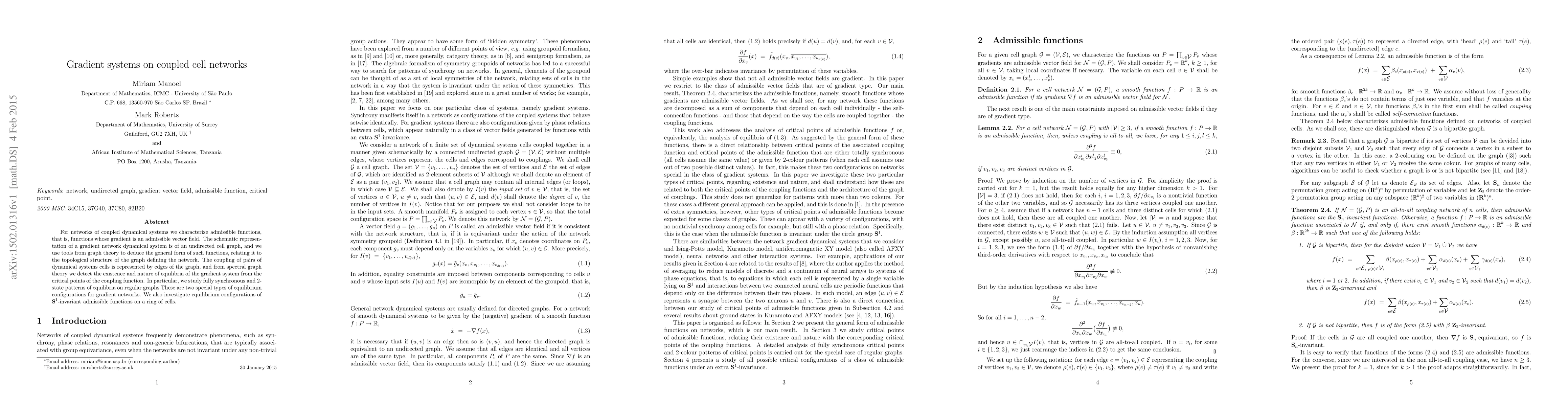 This paper investigates gradient systems on coupled cell networks, characterizing admissible functions based on graph theory and spectral analysis, with implications for understanding equilibrium configurations and their stability.