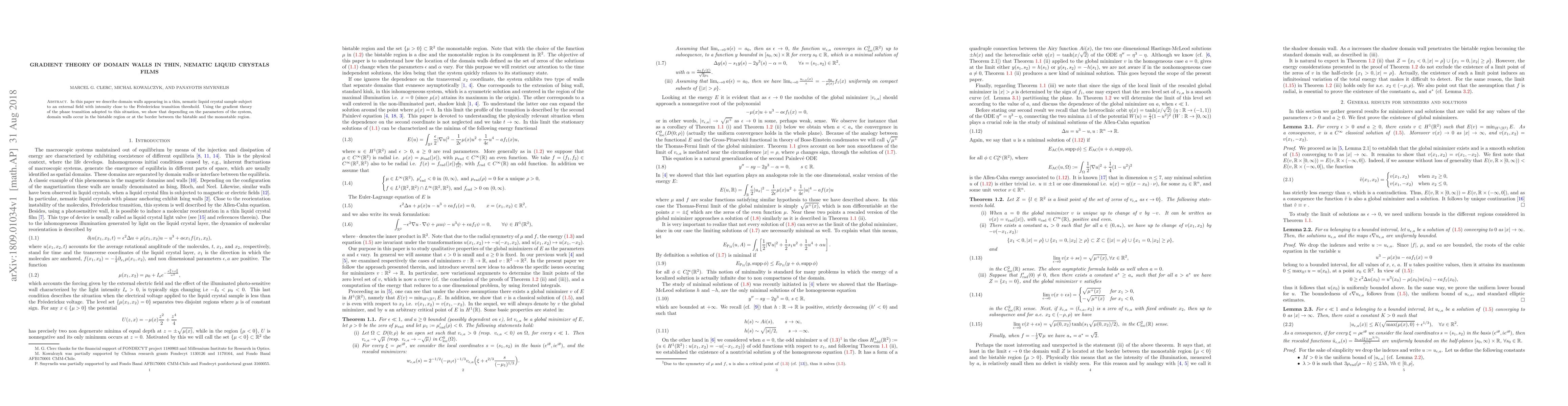 This paper explores domain walls in thin nematic liquid crystal films near the Fréedericksz transition threshold, demonstrating that gradient theory can predict whether domain walls form in the bistable or monostable regions based on system parameters.