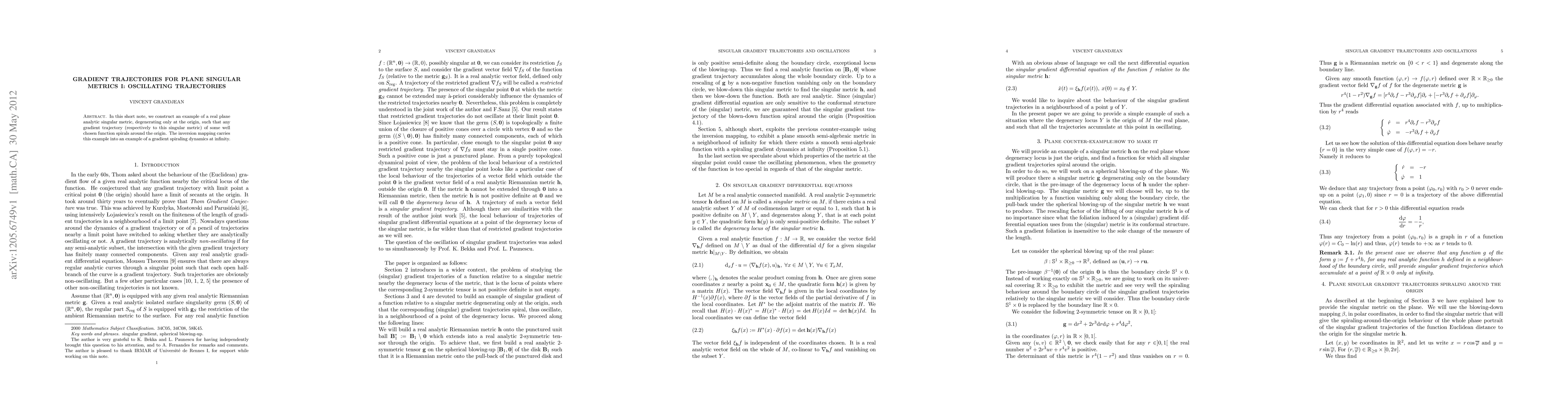 We construct an example of a real plane analytic singular metric, degenerating only at the origin, such that any gradient trajectory (respectively to this singular metric) of some well chosen function spirals around the origin. The inversion mapping carries this example into an example of a gradient spiraling dynamics at infinity.