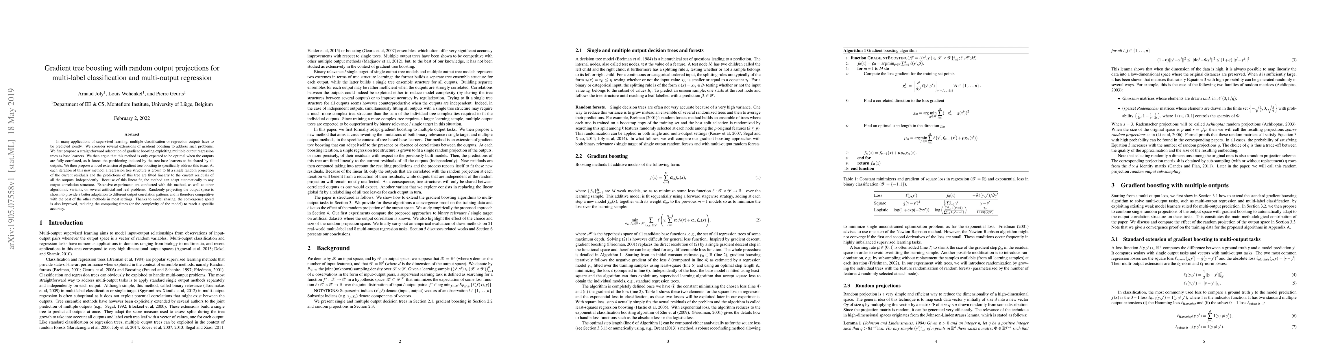 In many applications of supervised learning, multiple classification or regression outputs have to be predicted jointly. We consider several extensions of gradient boosting to address such problems. We first propose a straightforward adaptation of gradient boosting exploiting multiple output regression trees as base learners. We then argue that this method is only expected to be optimal when the outputs are fully correlated, as it forces the partitioning induced by the tree base learners to be shared by all outputs. We then propose a novel extension of gradient tree boosting to specifically address this issue. At each iteration of this new method, a regression tree structure is grown to fit a single random projection of the current residuals and the predictions of this tree are fitted linearly to the current residuals of all the outputs, independently. Because of this linear fit, the method can adapt automatically to any output correlation structure. Extensive experiments are conducted with this method, as well as other algorithmic variants, on several artificial and real problems. Randomly projecting the output space is shown to provide a better adaptation to different output correlation patterns and is therefore competitive with the best of the other methods in most settings. Thanks to model sharing, the convergence speed is also improved, reducing the computing times (or the complexity of the model) to reach a specific accuracy.