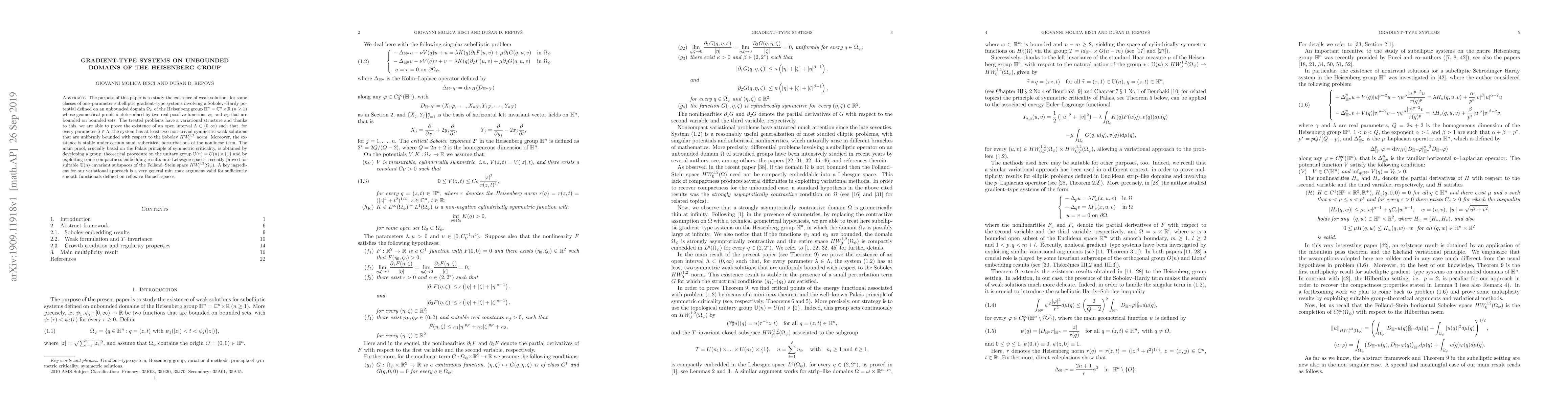 The purpose of this paper is to study the existence of weak solutions for some classes of one-parameter subelliptic gradient-type systems involving a Sobolev-Hardy potential defined on an unbounded domain $\Omega_\psi$ of the Heisenberg group $\mathbb{H}^n=\mathbb{C}^n\times \mathbb{R}$ ($n\geq 1$) whose geometrical profile is determined by two real positive functions $\psi_1$ and $\psi_2$ that are bounded on bounded sets. The treated problems have a variational structure and thanks to this, we are able to prove the existence of an open interval $\Lambda\subset (0,\infty)$ such that, for every parameter $\lambda\in \Lambda$, the system has at least two nontrivial symmetric weak solutions that are uniformly bounded with respect to the Sobolev $HW^{1,2}_0$-norm. Moreover, the existence is stable under certain small subcritical perturbations of the nonlinear term. The main proof, crucially based on the Palais principle of symmetric criticality, is obtained by developing a group-theoretical procedure on the unitary group $\mathbb{U}(n)=U(n)\times\{1\}$ and by exploiting some compactness embedding results into Lebesgue spaces, recently proved for suitable $\mathbb{U}(n)$-invariant subspaces of the Folland-Stein space $HW^{1,2}_0(\Omega_\psi)$. A key ingredient for our variational approach is a very general min-max argument valid for sufficiently smooth functionals defined on reflexive Banach spaces.