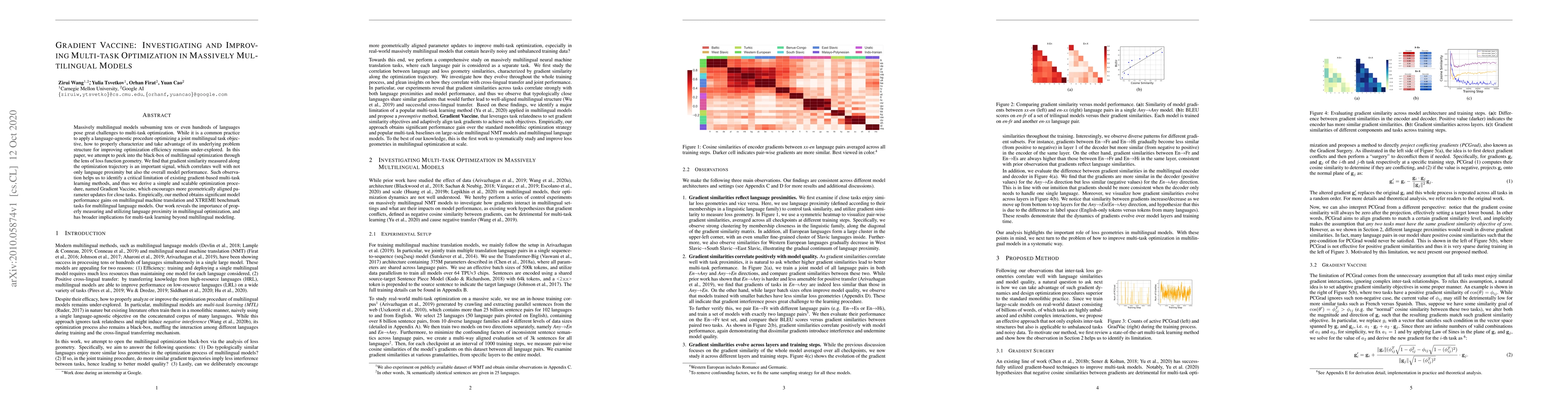 This paper investigates the optimization of multilingual models by analyzing gradient similarity to enhance multi-task learning efficiency. The proposed Gradient Vaccine method encourages geometrically aligned parameter updates, leading to significant performance gains in multilingual machine translation and XTREME benchmarks.