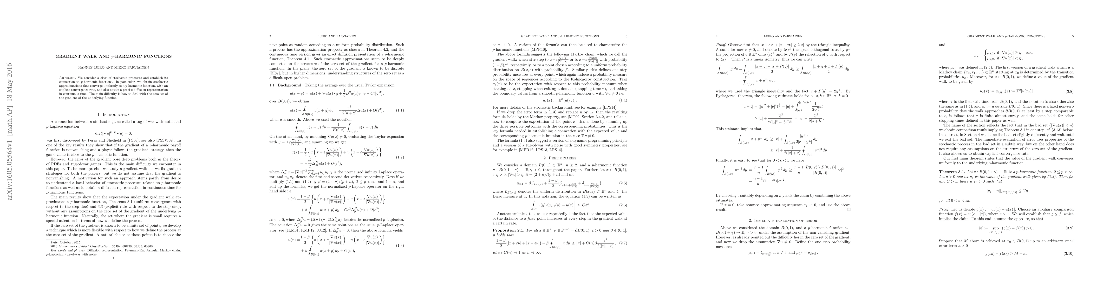 This paper explores stochastic processes linked to $p$-harmonic functions, providing stochastic approximations that converge uniformly to these functions with a specified rate. It also presents a precise diffusion representation in continuous time, addressing the challenge of the zero set of the gradient.