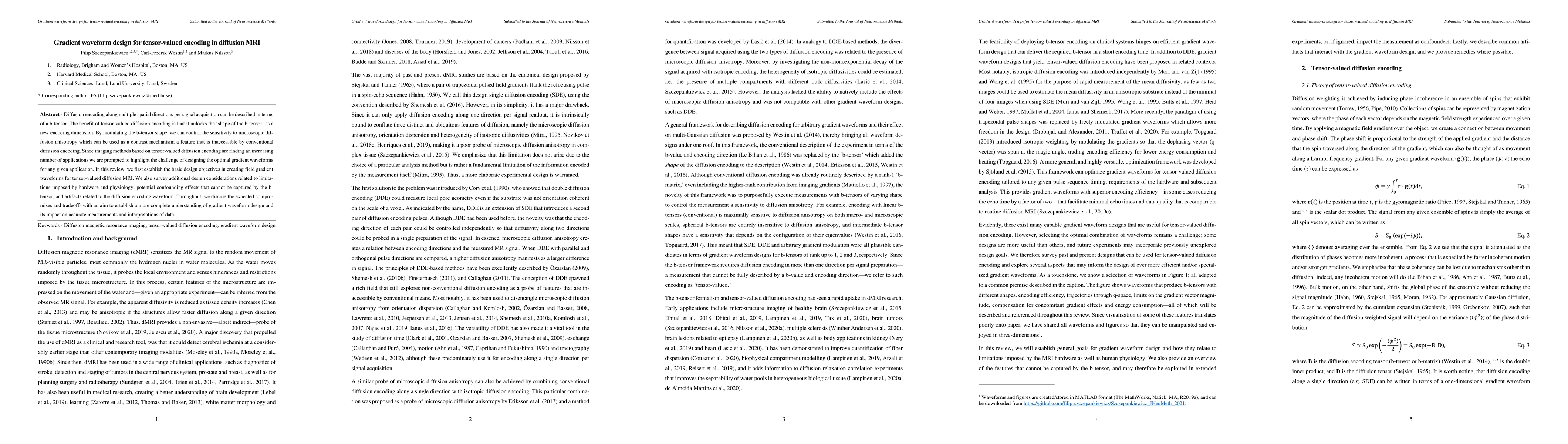 This paper reviews the design of gradient waveforms for tensor-valued diffusion MRI, emphasizing the benefits of modulating the b-tensor shape for enhanced contrast. It discusses the challenges and trade-offs in waveform design, including hardware limitations and physiological effects, to improve data accuracy and interpretation.