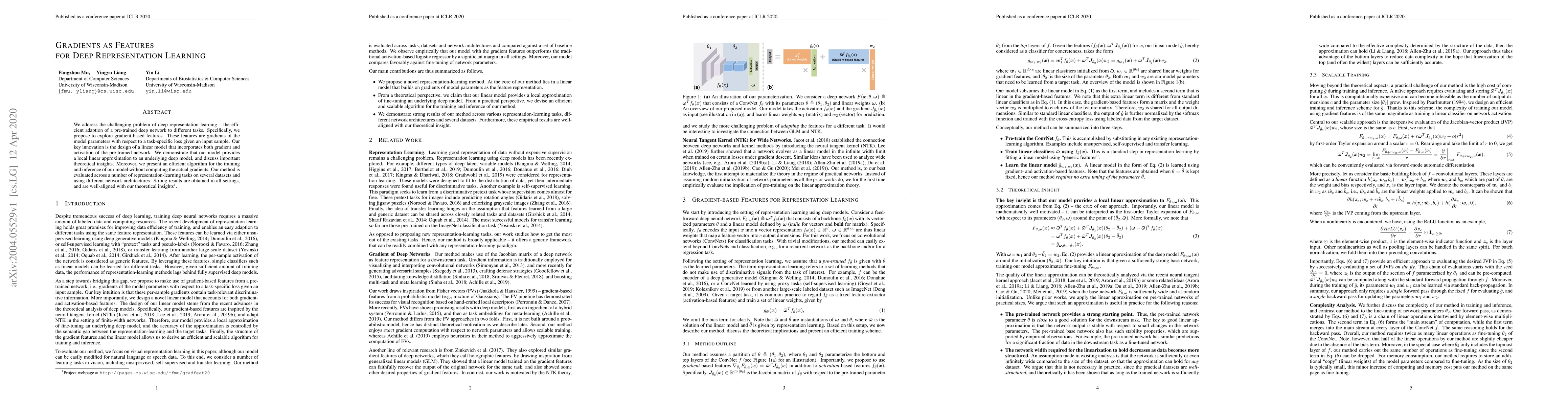 This paper proposes using gradients from a pre-trained deep network as features for efficient adaptation to new tasks. It introduces a linear model that incorporates both gradient and activation information, providing a local approximation of the deep model. The method is effective across various tasks and datasets, offering strong results without needing actual gradient computation.