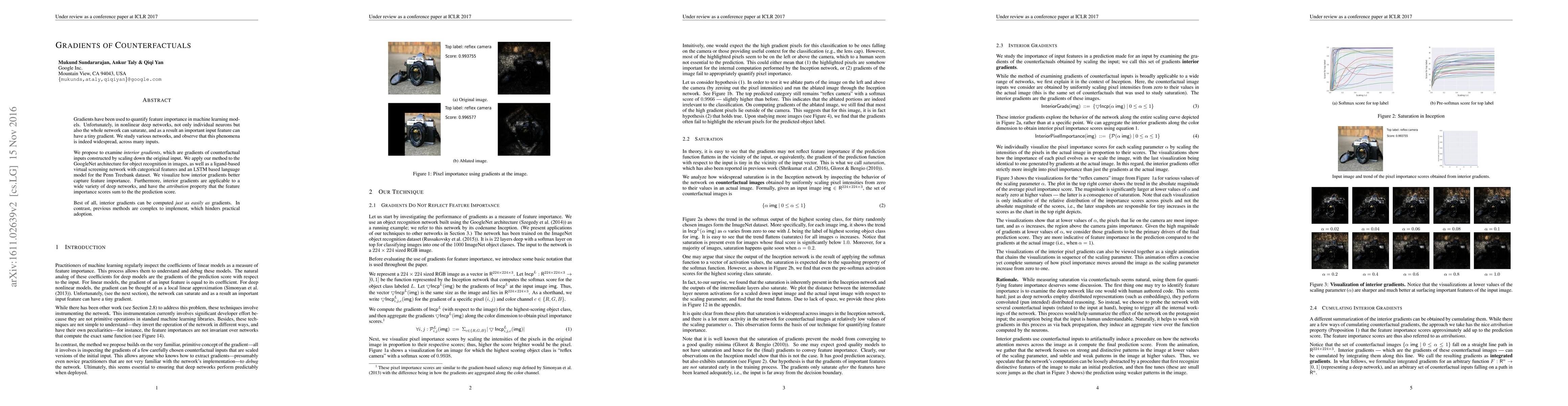 Gradients have been used to quantify feature importance in machine learning models. Unfortunately, in nonlinear deep networks, not only individual neurons but also the whole network can saturate, and as a result an important input feature can have a tiny gradient. We study various networks, and observe that this phenomena is indeed widespread, across many inputs. We propose to examine interior gradients, which are gradients of counterfactual inputs constructed by scaling down the original input. We apply our method to the GoogleNet architecture for object recognition in images, as well as a ligand-based virtual screening network with categorical features and an LSTM based language model for the Penn Treebank dataset. We visualize how interior gradients better capture feature importance. Furthermore, interior gradients are applicable to a wide variety of deep networks, and have the attribution property that the feature importance scores sum to the the prediction score. Best of all, interior gradients can be computed just as easily as gradients. In contrast, previous methods are complex to implement, which hinders practical adoption.