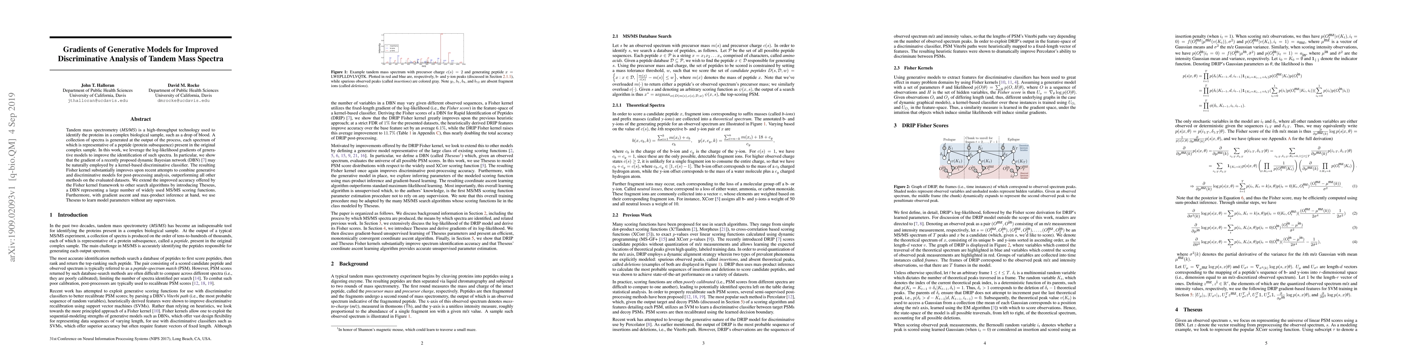 Tandem mass spectrometry (MS/MS) is a high-throughput technology used toidentify the proteins in a complex biological sample, such as a drop of blood. A collection of spectra is generated at the output of the process, each spectrum of which is representative of a peptide (protein subsequence) present in the original complex sample. In this work, we leverage the log-likelihood gradients of generative models to improve the identification of such spectra. In particular, we show that the gradient of a recently proposed dynamic Bayesian network (DBN) may be naturally employed by a kernel-based discriminative classifier. The resulting Fisher kernel substantially improves upon recent attempts to combine generative and discriminative models for post-processing analysis, outperforming all other methods on the evaluated datasets. We extend the improved accuracy offered by the Fisher kernel framework to other search algorithms by introducing Theseus, a DBN representing a large number of widely used MS/MS scoring functions. Furthermore, with gradient ascent and max-product inference at hand, we use Theseus to learn model parameters without any supervision.