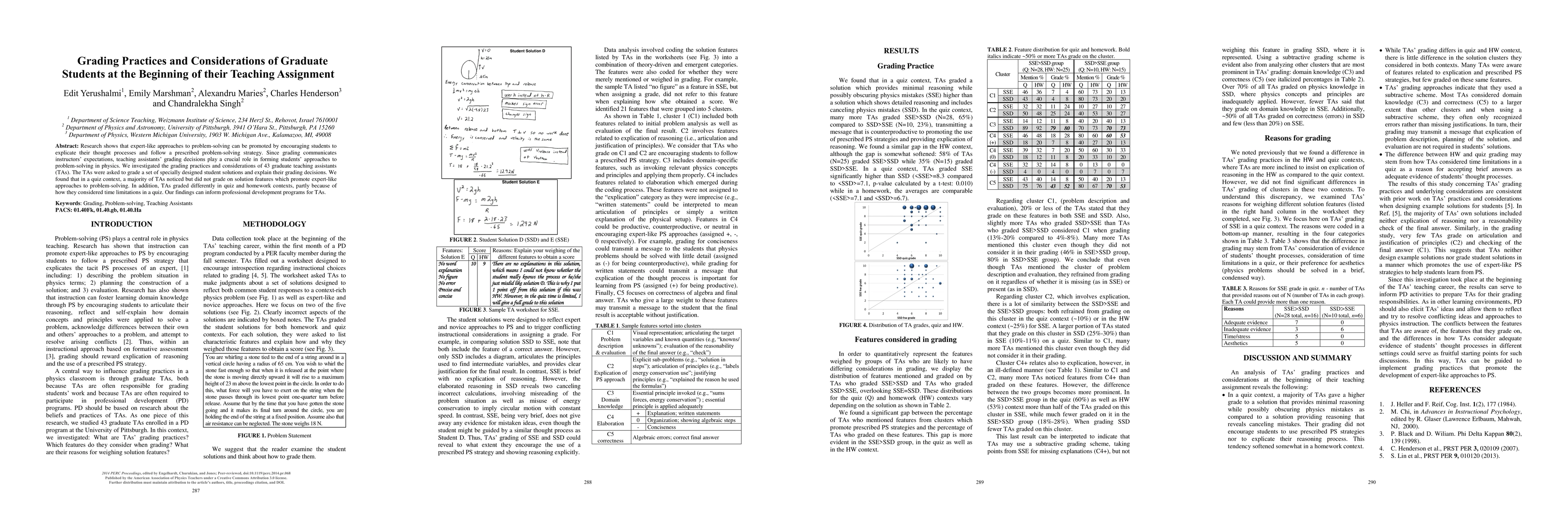 This study examines the grading practices of 43 graduate teaching assistants, revealing that while most noticed features promoting expert-like problem-solving, they often did not incorporate these into their grading. TAs also showed context-dependent grading, influenced by perceived time constraints in quizzes, suggesting a need for professional development to align grading with instructional goals.