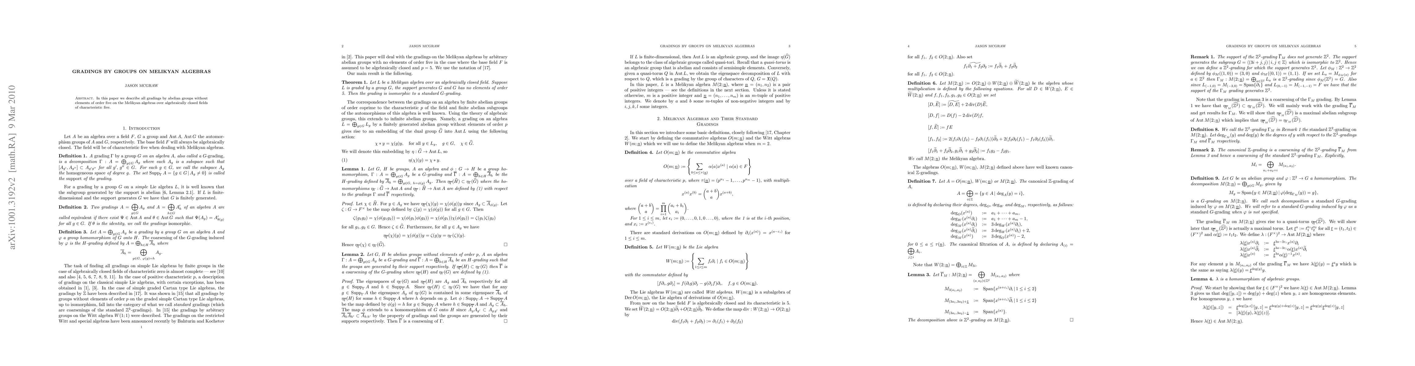 Summary: This research identifies all abelian group gradings excluding those with order five elements on Melikyan algebras over algebraically closed fields. It systematically explores the structure and classification of such gradings.
