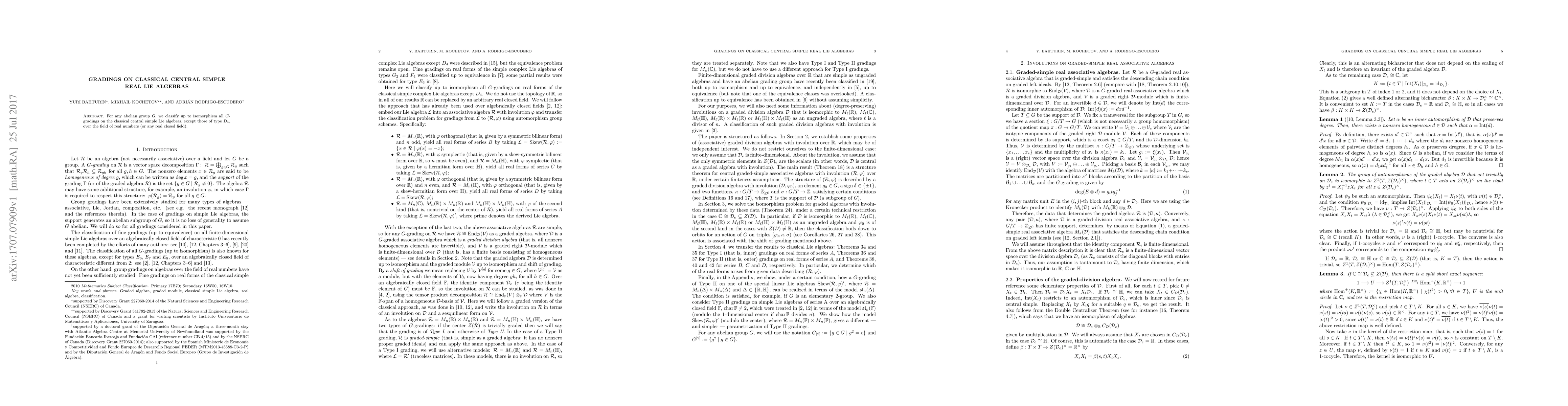 This paper classifies up to isomorphism all abelian group $G$-gradings on classical central simple real Lie algebras, excluding those of type $D_4,$ over real closed fields. The focus is on understanding the structure and properties of these gradings.
