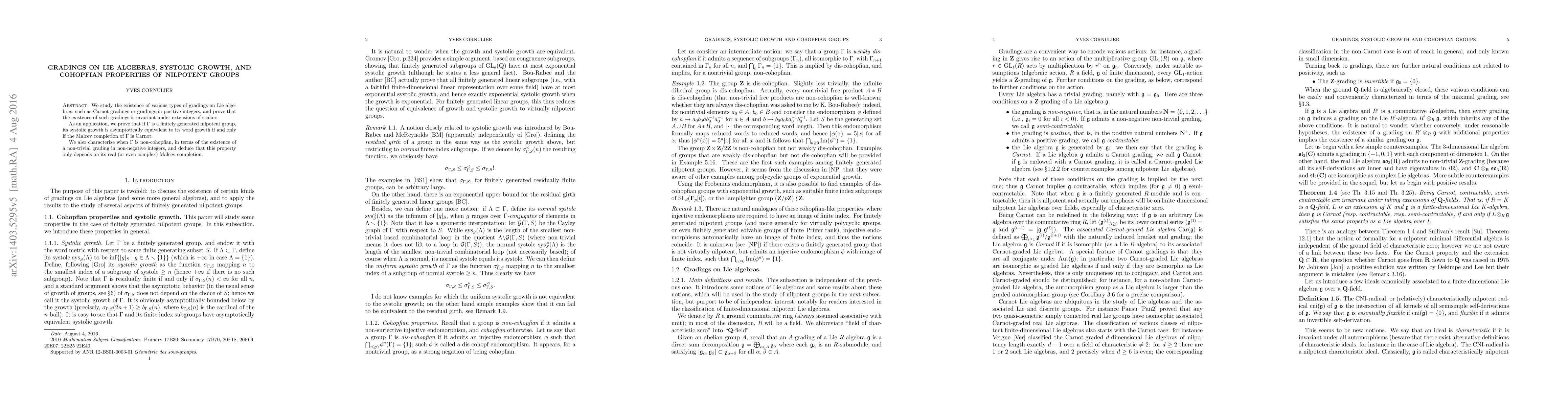 This research explores gradings on Lie algebras, showing their invariance under scalar extensions. It links the asymptotic equivalence of a nilpotent group's systolic and word growth to its Malcev completion being Carnot. The study also identifies conditions for a nilpotent group to be non-cohopfian based on gradings in non-negative integers, which depends on its Malcev completion's real or complex properties.