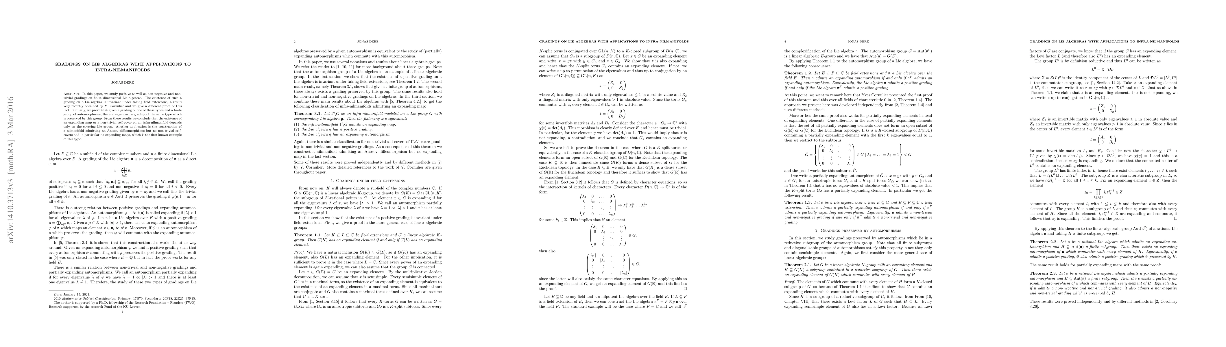 This paper investigates various gradings on finite-dimensional Lie algebras and demonstrates their invariance under field extensions. It constructs a positive grading preserved by a finite automorphism group, leading to conclusions about the existence of expanding maps and non-trivial self-covers on infra-nilmanifolds, including the first example of a nilmanifold with an Anosov diffeomorphism but no such self-covers.