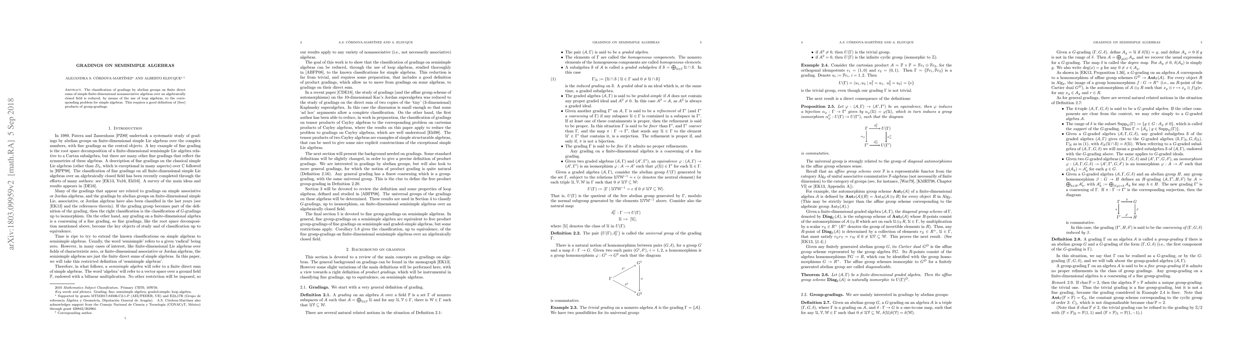 This paper classifies gradings on finite direct sums of simple nonassociative algebras by abelian groups, reducing the problem to simpler cases using loop algebras and introducing the concept of free products of group-gradings. The focus is on semisimple algebras over algebraically closed fields.