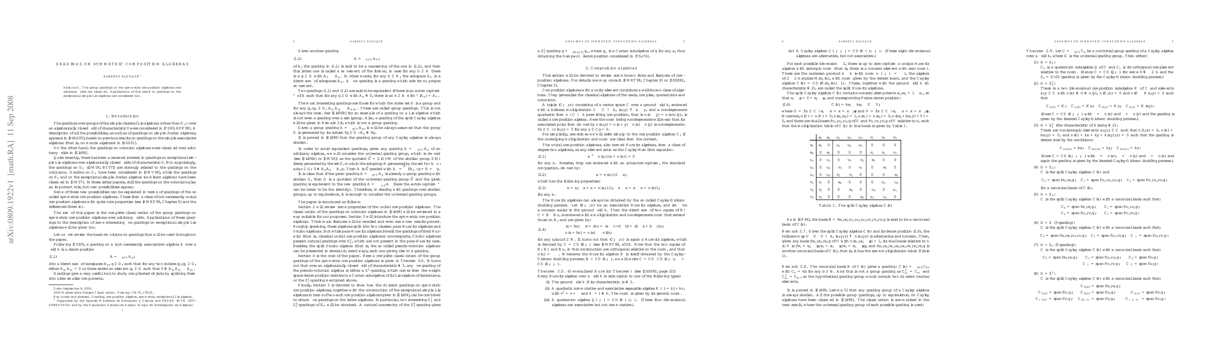 The group gradings on the symmetric composition algebras over arbitrary fields are classified. Applications of this result to gradings on the exceptional simple Lie algebras are considered too.