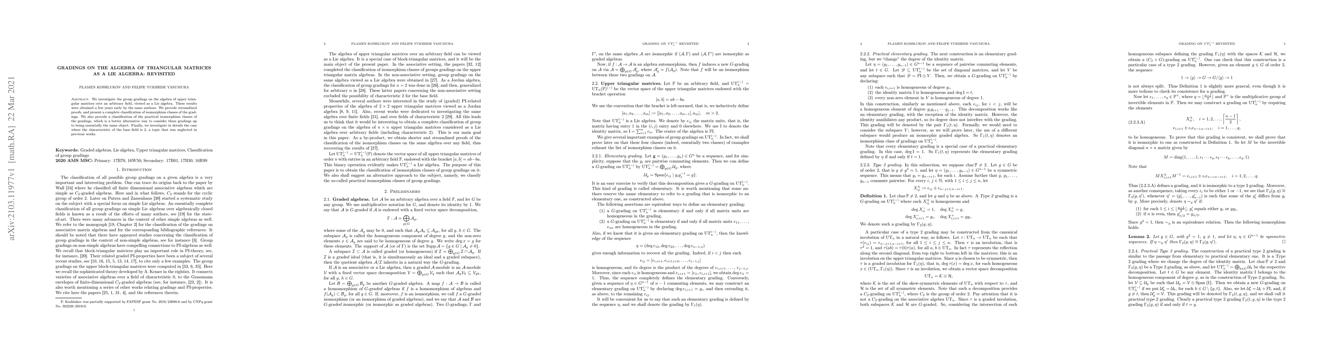 We investigate the group gradings on the algebra of upper triangular matrices over an arbitrary field, viewed as a Lie algebra. These results were obtained a few years early by the same authors. We provide streamlined proofs, and present a complete classification of isomorphism classes of the gradings. We also provide a classification of the practical isomorphism classes of the gradings, which is a better alternative way to consider these gradings up to being essentially the same object. Finally, we investigate in details the case where the characteristic of the base field is $2$, a topic that was neglected in previous works.