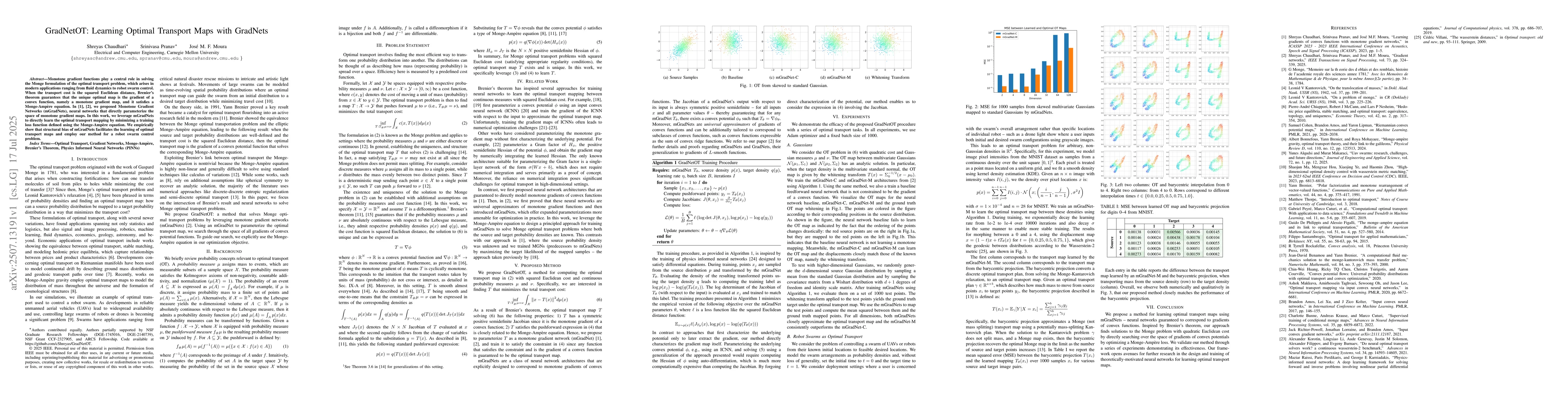 Monotone gradient functions play a central role in solving the Monge formulation of the optimal transport problem, which arises in modern applications ranging from fluid dynamics to robot swarm control. When the transport cost is the squared Euclidean distance, Brenier's theorem guarantees that the unique optimal map is the gradient of a convex function, namely a monotone gradient map, and it satisfies a Monge-Amp\`ere equation. In [arXiv:2301.10862] [arXiv:2404.07361], we proposed Monotone Gradient Networks (mGradNets), neural networks that directly parameterize the space of monotone gradient maps. In this work, we leverage mGradNets to directly learn the optimal transport mapping by minimizing a training loss function defined using the Monge-Amp\`ere equation. We empirically show that the structural bias of mGradNets facilitates the learning of optimal transport maps and employ our method for a robot swarm control problem.
